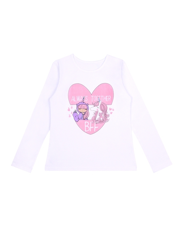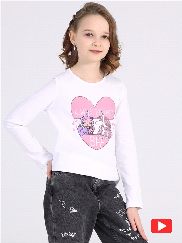 Состав: кулир / хлопок 100%. Лонгслив для девочки выполнен из тонкого хлопкового полотна. Изделие с длинными рукавами, украшено стильным принтом. Отличный выбор на каждый день! Уход: только машинная с... Показать описаниетирка (руками не стирать!) при температуре 40 градусов, без предварительного замачивания. Изделия с печатью и декором перед стиркой необходимо вывернуть на изнаночную сторону.