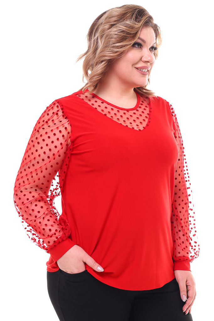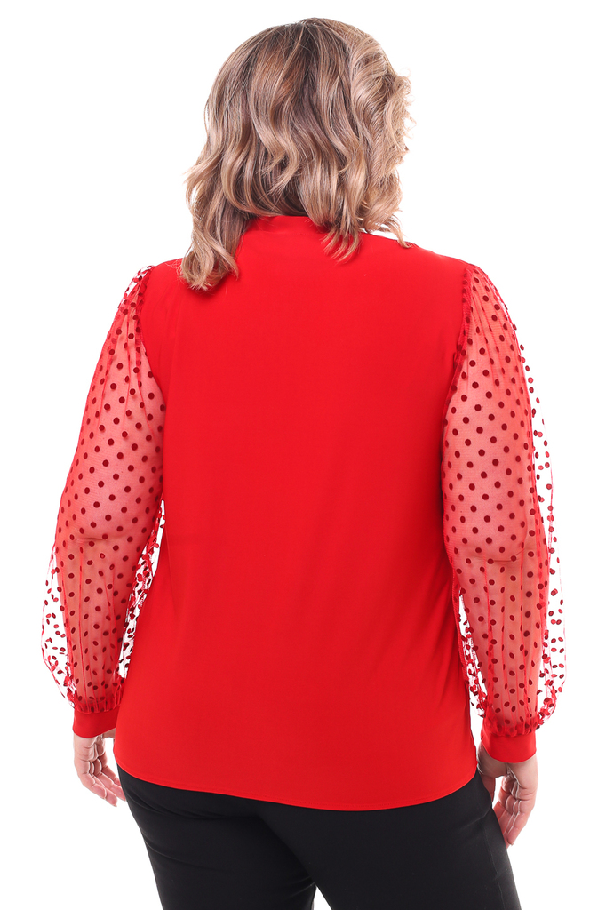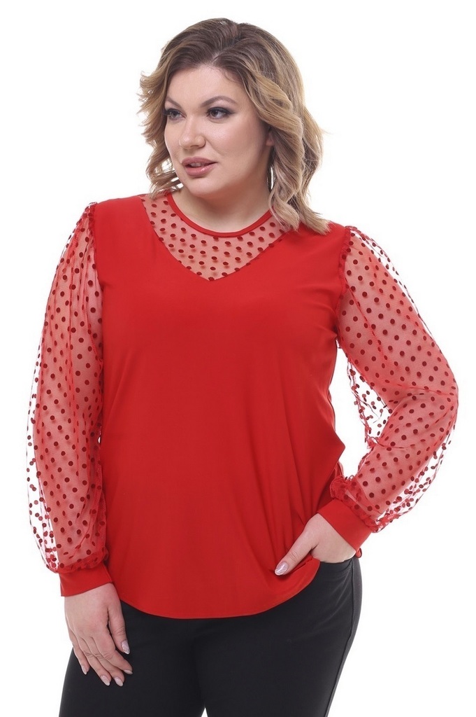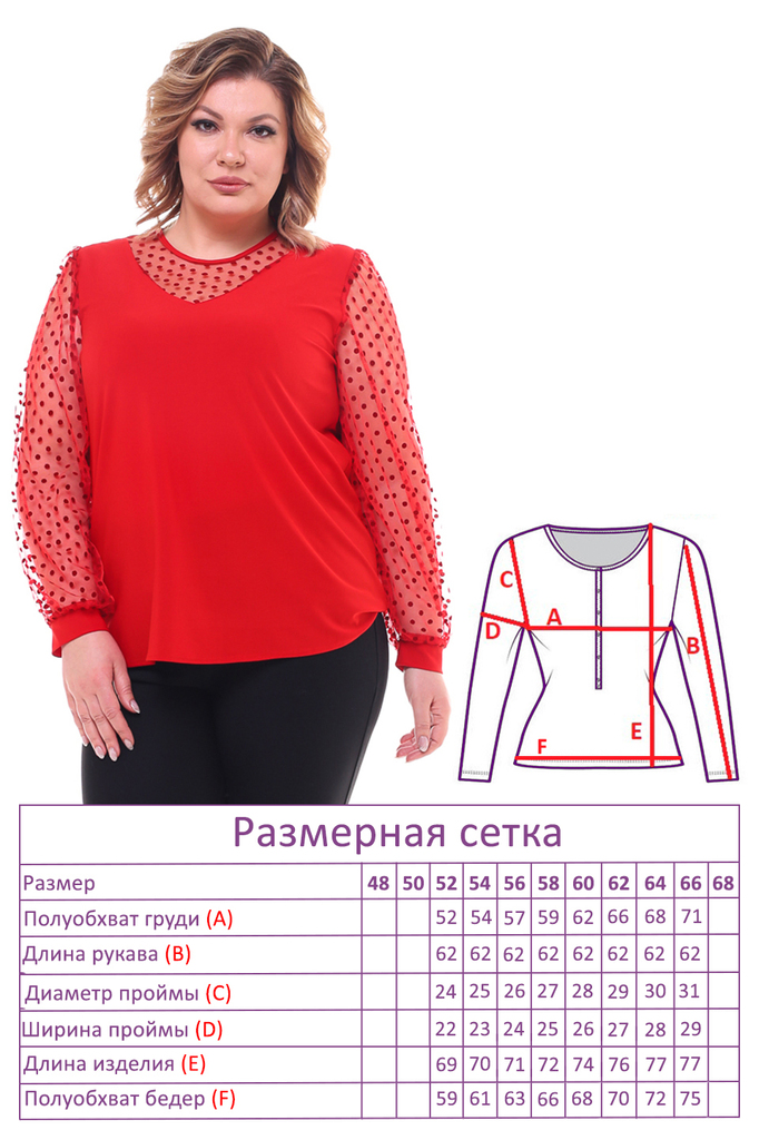 Блузка с фатиновыми рукавами "горошек" красная Элегантная блузка из мягкого материала. Круглый вырез оформлен прозрачной вставкой на груди. Фатиновые рукава с флоковым напылением в оригинальный принт ... Показать описаниедобавляет модели воздушности и лёгкости. Рукава по низу присобраны тонкой резинкой. Центральный шов по спинке обеспечивает хорошую посадку по фигуре и визуально стройнит. Центральный шов дополнен потайной застёжкой-молнией. Вы можете носить её с юбками различной длины, брюками и джинсами. Мягкий, приятный телу материал подарит комфорт на весь день. Для завершения стильного образа можно использовать туфли на высоких каблуках. Длина изделия 50 размера по спинке - 68 см. В каждом следующем размере длина увеличивается.