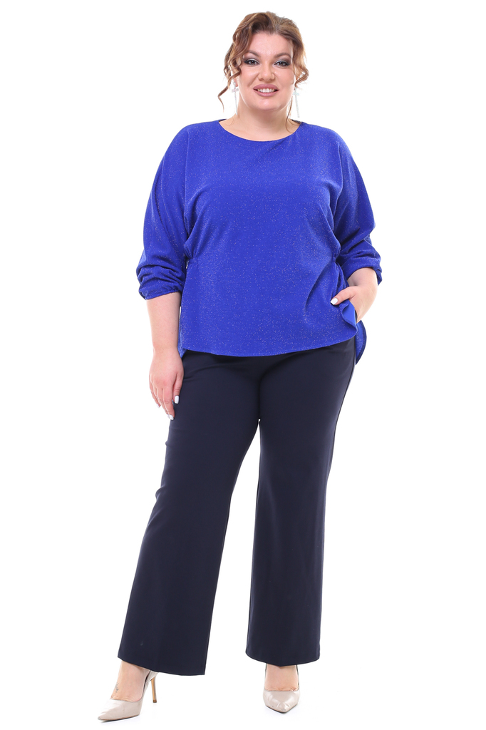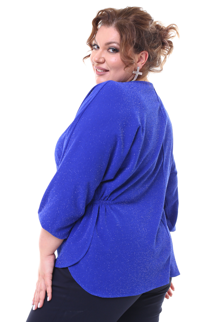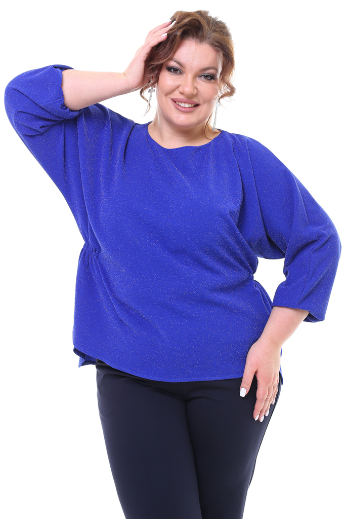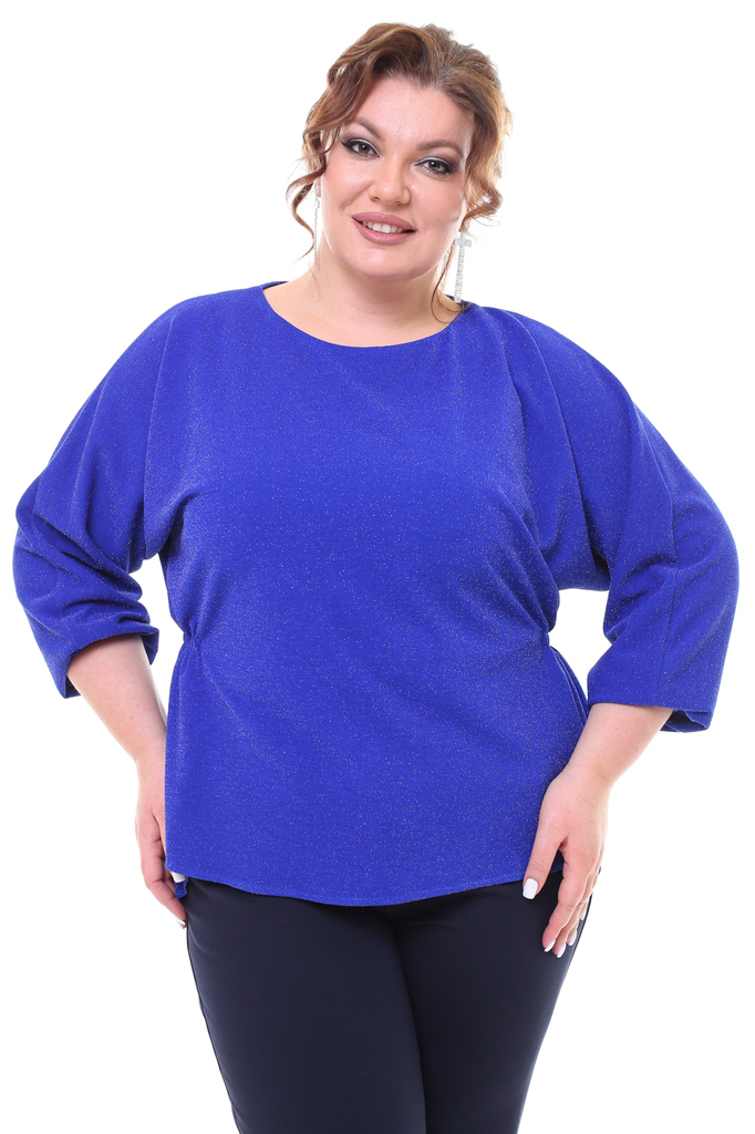 Блузка блестящая со сборкой на талии однотонная электрик Блузка свободного кроя из мягкого струящегося материала. Модель имеет классический круглый вырез. Широкие цельнокроеные рукава длиной ? по низу... Показать описание присобраны тонкой резинкой. Центральный шов по спинке и небольшие закругленные разрезы по бокам способствуют оптимальной посадке по фигуре. Блузка присобрана по бокам небольшими резинками, маскируя мелкие недостатки в области живота и талии. Модель не сковывает движений и искусно обыгрывает фигуру. Модель отлично комбинируется с узкими брюками, легинсами и юбками Длина изделия 50 размера по спинке - 77 см. В каждом следующем размере длина увеличивается.