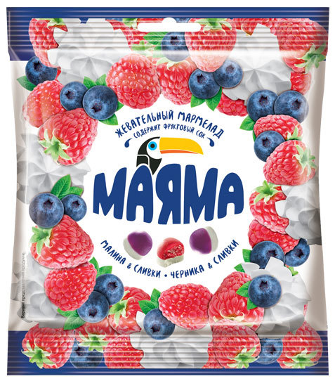 Мармелад «Маяма» жевательный, с желейной начинкой со вкусом черники и малины со сливками Жевательный мармелад с желейной начинкой со вкусом черники и малины со сливками. Мармелад содержит фруктовый со... Показать описаниек. Жевательный мармелад гармонично вписывается в систему здорового питания: - в мармеладе отсутствуют жиры - нет искусственных красителей - в основе лакомства натуральный сок фруктов - желатин улучшает состояние кожи и волос - пектин выводит токсины