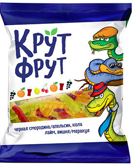 Мармелад «Крут Фрут» жевательный, в форме забавных змеек Жевательный мармелад в виде забавных змеек. Мармелад со вкусом вишни и маракуйи, колы и лайма, черной смородины и апельсина. Жевательный мармел... Показать описаниеад гармонично вписывается в систему здорового питания: - в мармеладе отсутствуют жиры - нет искусственных красителей - в основе лакомства натуральный сок ягод и фруктов.СОСТАВ: глюкозно-фруктозный сироп, сахар, желатин, концентрированный яблочный сок, регулятор кислотности: лимонная кислота; агент желирующий: пектин; глазирователь (карнаубский и пчелиный воски, антиокислители: альфа-Токоферол, Е304(i)); концентрированный сок из черной моркови, смесь концентрированных соков моркови, черной смородины, ароматизаторы, красители: Е150c; кармин, уголь растительный, каротин, медный комплекс хлорофиллинов, куркумин. Продукт может содержать консервант диоксид серы.