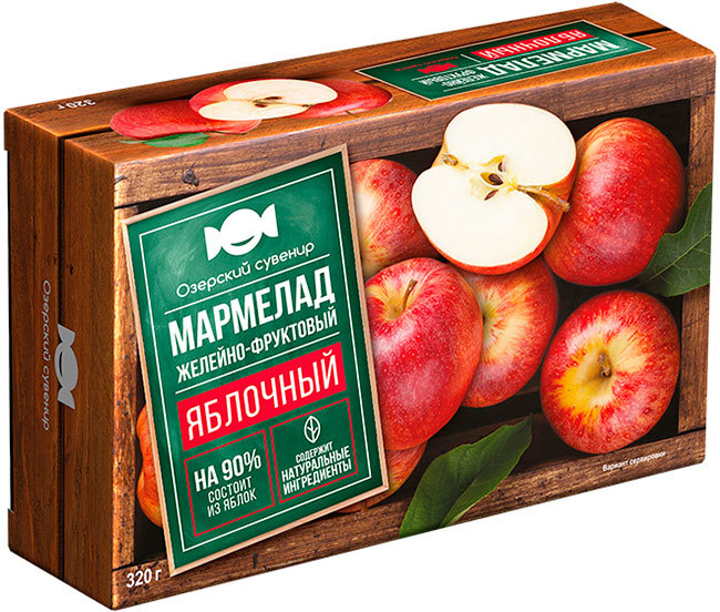 Мармелад «Озерский сувенир» «Яблочный» Мармелад желейный, с кусочками яблок. В составе мармелада только натуральные ингредиенты. На 90% состоит из яблок. Мармелад приготовлен по традиционной технологи... Показать описаниеи - на природных желирующих компонентах. Яркий и насыщенный вкус десерту дарит сок отборных яблок.