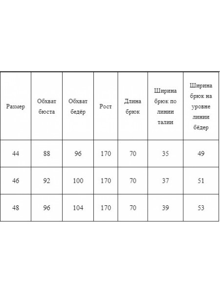 Доступность: в наличии; Производитель: Abbi; Страна производства: Беларусь; Артикул: 954789; Размеры: 48 - 60; Материал: Вискоза 60%, хлопок 35%, эластан 5%; Сезон: Весна, Лето. Брюки-палаццо с высоко... Показать описанией посадкой из смесовой ткани, длинные и широкие штанины. Универсальная модель, которая подойдёт для любых типов фигуры. Мягкие складки по переду, притачной пояс на резинке хорошо тянется и отлично ложится по фигуре, боковые функциональные карманы. Являются безупречным вариантом для создания современного образа. Молодежная модель брюк палаццо прекрасно вписываются в школьную форму и станут любимой вещью модницы. Прекрасно сочетаются с нарядной и летней блузой для свидания и они прекрасно впишутся в праздничный образ, будут прекрасным подарком маме, жене, сестре, тете или любимой подруге на любой праздник и юбилей, хоть на день рождения или на 8 марта. И даже сюрприз просто так, на день влюбленных 14 февраля. Однотонные оттенки и мягкий дышащий материал с гипо-аллергенным эффектом для защиты тела в холодную погоду зимой и для высоких температур летом, осенью и весной. Представлены в базовых цветах. Легкий уход - деликатная стирка при 30 градусах без отбеливателей и отжима с легкой глажкой и сушкой в естественных условиях. Брюки женские станут отличным дополнением офисного стиля. Женские брюки это классика современного стиля. Брюки с карманами, брюки женские - вы найдете в нашем магазине, стиль и дизайн на любой вкус. Модель можно носить как штаны с завышенной талией школьные. Или брюки в офис. Брюки офисные не обязательно должны быть строгих черно-синих оттенков, позвольте себе экспериментировать с образом и не стеснятся ярких красок. брючки на молнии женские, практичная часть гардероба. брюки со стрелками так же подойдут и подростку как школьный образ. Купить брюки женские можно в нашем магазине, как и платье, шорты, жакеты, верхнюю одежду и аксессуары. Замеры:. Размер 46. ОТ-76-86; ОБ-118 ; ДИ-114. Размер 48. ОТ-80-90; ОБ- 120; ДИ-114. Размер 50. ОТ-84-94; ОБ-124 ; ДИ-1