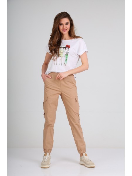Доступность: в наличии; Производитель: AXXA; Страна производства: Беларусь; Артикул: 831748; Размеры: 42 - 46; Рост: 170 см; Материал: блуза- вискоза 96%, спандекс 4%брюки- хлопок 94%, эластан 6%; Дли... Показать описаниена блузы: 58 см; Длина рукава (кимоно): 21 см; Длина брюк: 100 см. Модный молодежный костюм, состоящий из блузы прямого свободного силуэта и брюк, выполненных из качественного хлопкового полотна - отличный вариант для активного отдыха. Центральная часть переда блузы декорирована стильной термоаппликацией. Горловина округлой формы. Рукав короткий цельнокроеный на основе «летучая мышь», по низу которого выполнена притачная манжета. Брюки прямые, на притачном поясе с частичной сборкой на резинку и застежкой типа «гульфик». Между поясом и боковым швом расположены подрезы – вход в карманы. На середине бедра выполнены горизонтальные подрезы по передней части от подреза к низу брюк, по боковой части расположены карманы с встречной складкой и отлетными клапанами. По одной половине брюк выполнен накладной карман ниже уровня колена. Низ брюк оформлен притачной манжетой с вставленной резинкой. В качестве отделочного элемента на кармане и поясе используется декоративная репсовая тесьма. Этот комплект станет излюбленным предметом гардероба для активной девушки, подарит чувство стиля и комфорта на каждый день.