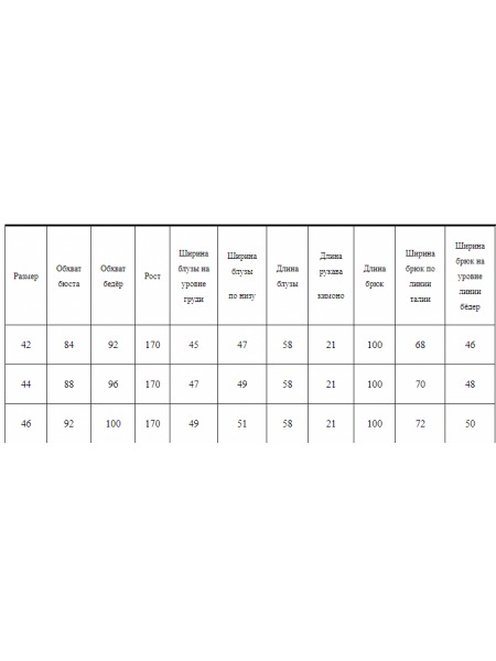 Доступность: в наличии; Производитель: AlaniCollection; Страна производства: Беларусь; Артикул: 899935; Размеры: 42 - 46; Рост: 164 см; Материал: блуза- хлопок 98%, эластан 2%,брюки- полиэстер 70%, ви... Показать описаниескоза 25%, спандекс 5%; Сезон: Весна. Блуза полуприлегающего силуэта с застежкой на потайную молнию в среднем шве спинки. Перед с рельефными швами и талевыми вытачками. Спинка со средним швом и четырьмя талиевыми вытачками. Рукава –реглан, одношовные, длиной ? с увеличенным объемом в верхней части. Длина блуза по среднему шву спинки во всех р-ах -57. Длина рукава с плечом – р42-62, р44-62,5, р46-63. Ширина рукава на уровне глубины проймы ? - р42-25, р44-25,7, р46-26,5. ОГ ? - р42-44, р44-46, р46-48. ОТ ? - р42-39, р44-41, р46-43. ОБ ? - р42-47, р44-49, р46-51. Брюки длиной 7/8, зауженные к низу, на притачном поясе с пятью шлевками. Застежка в среднем шве на тесьму-молнию и две петли и пуговицы. По передним частям с боковыми карманами. По задним частям с притачной кокеткой. По низу брюки с отворотом. Длина брюк от талии по боковому шву – р42-86, р44-86,5, р46-87. ОТ ? - р42-34, р44-36, р46-38. ОБ ? - р42-45,5, р44-47,5, р46-49,5