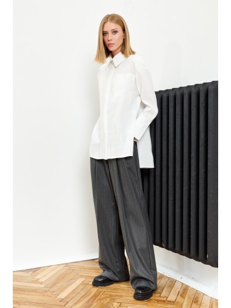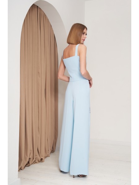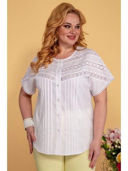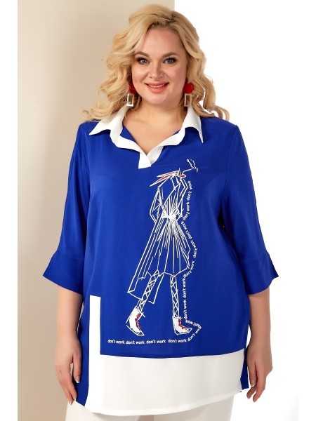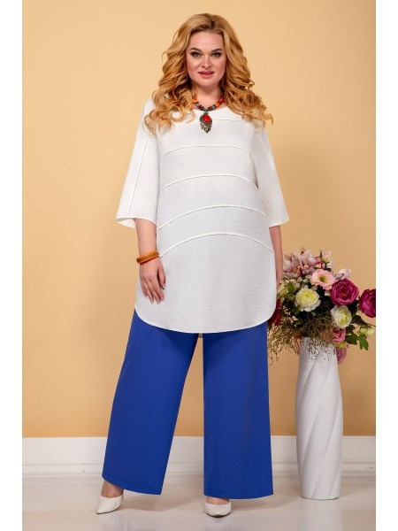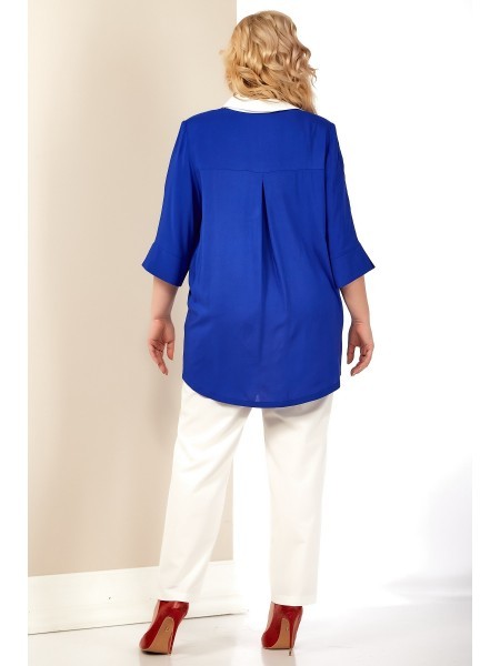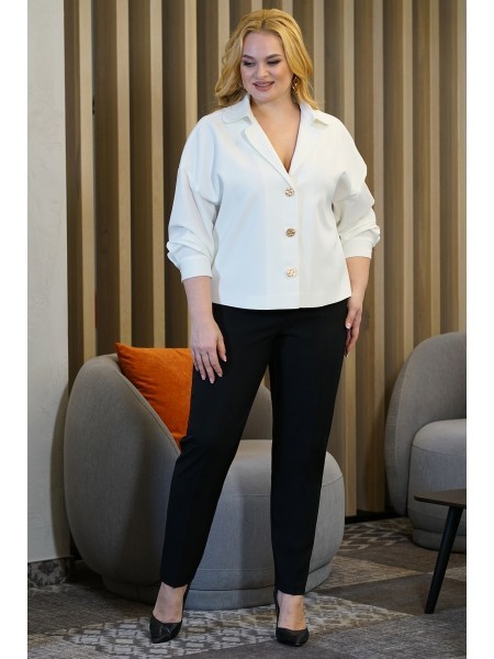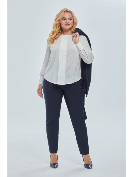 Доступность: в наличии; Производитель: AiraStyle; Страна производства: Беларусь; Артикул: 951301; Размеры: 60 - 64; Рост: 164 см; Материал: Блуза- хлопок 100%Брюки- полиэстер 70%, вискоза 25%, спандек... Показать описаниес 5%; Длина по центру спинки: 82 см.; Длина рукава: 42 см.; Длина брюк: 105 см.; Сезон: Весна, Лето. Комплект женский, состоящий из блузки и брюк. Блузка из однотонной приятной на ощупь хлопковой ткани, с плечевыми накладками, с рубашечным воротником на стойке; с разрезами в верхней и нижней части переда, которые оформлены планками. Перед с нагрудными вытачками от пройм, с притачной отделочной деталью по низу. Отделочная деталь, планки и воротник выполнены из креп-шифона. Перед декорирован печатью. Спинка с кокеткой и встречной складкой по центру. Рукава втачные, двухшовные (со швом по центру), длиной ?, по низу оформлены манжетами с разрезами. Брюки из эластичной ткани, зауженные к низу; на притачном поясе с резинкой по бокам, застегивающемся на одну обметанную петлю и одну пуговицу. В среднем шве передних частей брюк застежка по типу «гульфик» на тесьму-«молнию».
