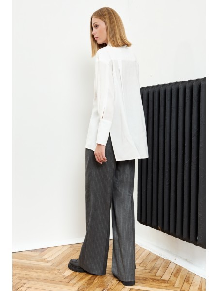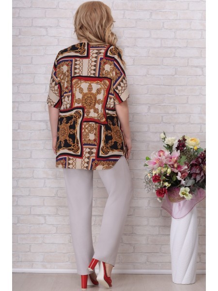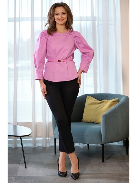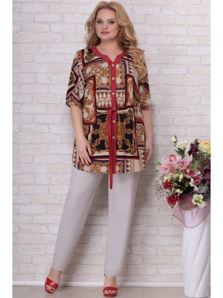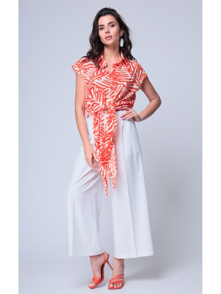 Доступность: в наличии; Производитель: AiraStyle; Страна производства: Беларусь; Артикул: 953831; Размеры: 60 - 64; Рост: 164 см; Материал: Блуза- хлопок 100%Брюки- полиэстер 70%, вискоза 25%, спандек... Показать описаниес 5%; Длина по центру спинки: 82 см.; Длина рукава: 42 см.; Длина брюк: 105 см.; Сезон: Весна, Лето. Комплект женский, состоящий из блузки и брюк. Блузка из однотонной приятной на ощупь хлопковой ткани, с плечевыми накладками, с рубашечным воротником на стойке; с разрезами в верхней и нижней части переда, которые оформлены планками. Перед с нагрудными вытачками от пройм, с притачной отделочной деталью по низу. Отделочная деталь, планки и воротник выполнены из креп-шифона. Перед декорирован печатью. Спинка с кокеткой и встречной складкой по центру. Рукава втачные, двухшовные (со швом по центру), длиной ?, по низу оформлены манжетами с разрезами. Брюки из эластичной ткани, зауженные к низу; на притачном поясе с резинкой по бокам, застегивающемся на одну обметанную петлю и одну пуговицу. В среднем шве передних частей брюк застежка по типу «гульфик» на тесьму-«молнию».