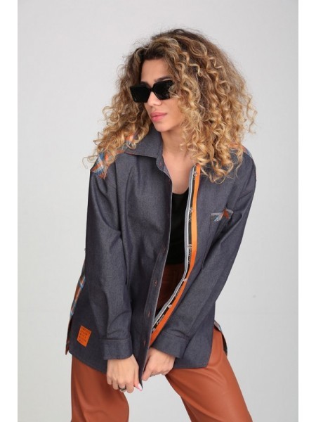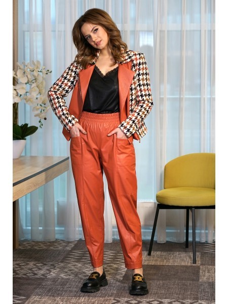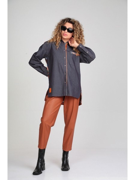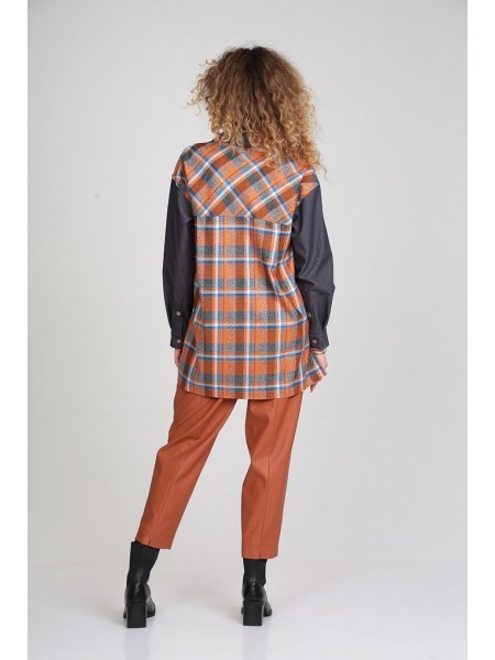 Доступность: в наличии; Производитель: ALEZA; Страна производства: Беларусь; Артикул: 956313; Размеры: 44 - 48; Рост: 164 см; Материал: хлопок 72%, ПЭ 26%, эластан 2%, ПЭ 80%, кожа 20%; Сезон: Демисез... Показать описаниеон. Рубашка комбинированная из двух видов ткани однотонного джинса и клетки, со стояче-отложным воротником на отрезной стойке и притачными фасонными планками с застежкой на 7 пуговиц, перед с накладным карманом и печатью по низу, спинка с кокеткой и 2 складками, рукава спущены, с притачными манжетами и планками по низу, с разрезами по боковым швам и фигурным низом. Брюки кожаные прямые слегка заужены книзу, на притачном поясе со складками по талии с застежкой спереди на кнопки и молнию, спереди боковые карманы, сзади вертикальные рельефы с разрезами по низу и имитацией карманов с листочками вверху.