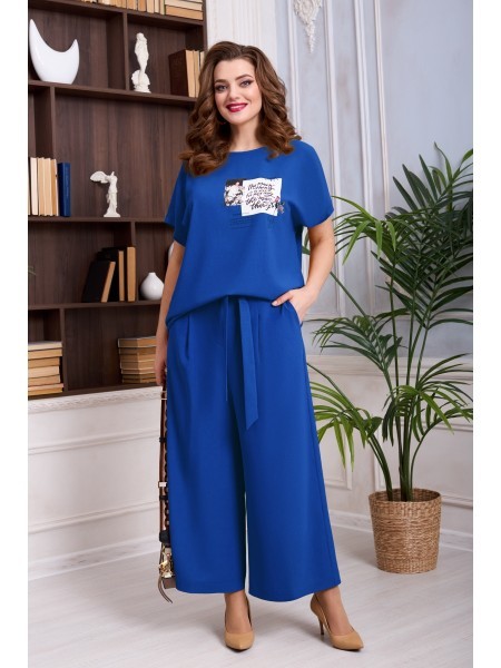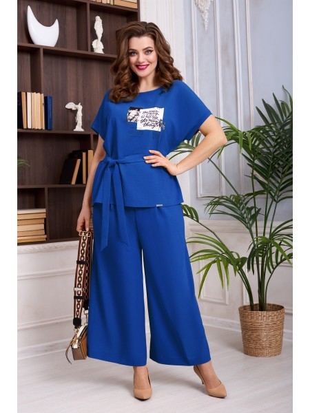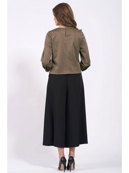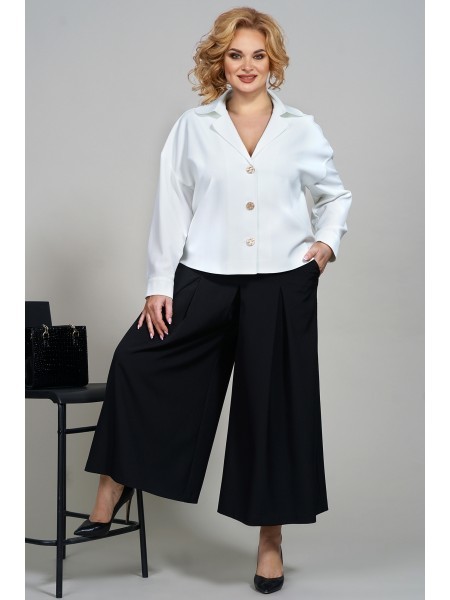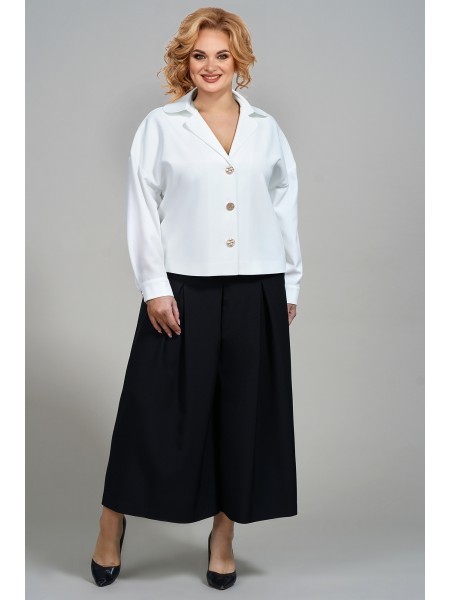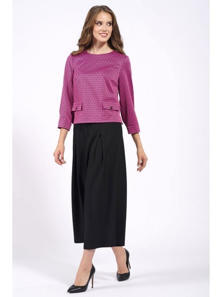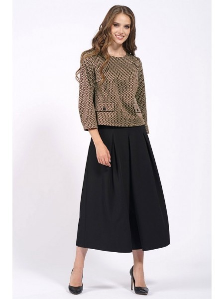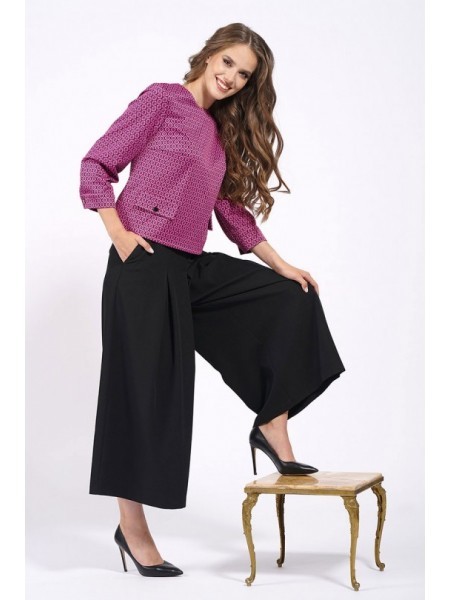 Доступность: в наличии; Производитель: AlaniCollection; Страна производства: Беларусь; Артикул: 931506; Размеры: 46 - 50; Рост: 164 см; Материал: блуза- 60%, вискоза 36%, эластан 4%, юбка-брюки- полиэ... Показать описаниестер 95%, спандекс 5%; Сезон: Демисезон. Блуза полуприлегающего силуэта из жаккарда (полотно средней плотности, эластичное). Перед с нагрудными вытачками и клапанами, которые декорированы пришивной пуговицей. Застежка в среднем шве спинки на навесную петлю-пуговицу. По боковым швам небольшие разрезы. Рукава втачные, одношовные с притачными манжетами, застегивающимися на одну петлю-пуговицу. Юбка-брюки широкие, свободные на притачном поясе с застежка на потайную тесьму-молнию в левом боковом шве. Передние части брюк со встречными мягкими складками и с косыми боковыми карманами. Задние части с талиевыми вытачками. Длина блузы по среднему шву спинки - р46-51, р48-52, р50-53. Длина рукава во всех р-ах - 51,5 см. Ширина рукава на уровне глубины проймы ? - р46-18, р48-18,7, р50-19,4. Ширина плеча во всех р-ах - 8 см. ОГ ? - р46-49, р48-51, р50-53. ОТ ? - р46-48, р48-50, р50-52. ОБ ? - р46-51, р48-53, р50-55. Длина брюк от талии по боковому шву во всех р-ах - 88 см. ОТ ? - р46-40, р48-42, р50-44. ОБ ? - р46-51, р48-53, р50-55.