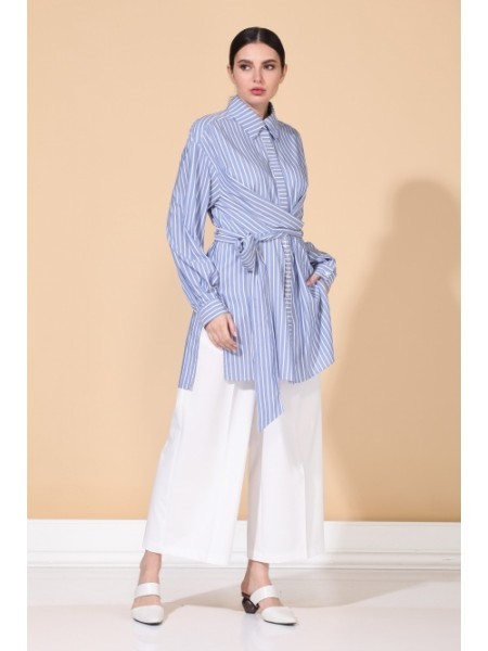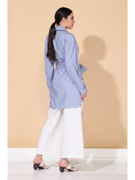 Доступность: в наличии; Производитель: ALEZA; Страна производства: Беларусь; Артикул: 923121; Размеры: 44 - 48; Рост: 170 см; Материал: хлопок 100%; Сезон: Круглогодичный. Комплект женский. Рубашка с ... Показать описаниецентральной застежкой на петли и пуговицы на планке с декоративной печатью. Перед отрезной по талии с цельнокроеными завязками, спинка с кокеткой, рукава рубашечного покроя со складками по низу на притачных манжетах. Воротник стояче-отложной на отрезной стойке. Низ фигурный с разрезами по боковым швам. Брюки кюлоты на притачном поясе, с застежкой спереди на молнию и пуговицу и с боковыми карманами