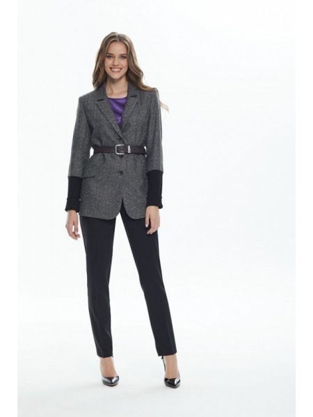 Доступность: в наличии; Производитель: ALLURE; Страна производства: Беларусь; Артикул: 935901; Размеры: 42 - 48; Рост: 170 см; Материал: Жакет, брюки- полиэстер-64%, вискоза- 33%, эластан-3%Блузка- ви... Показать описаниескоза-66%, нейлон-29%, спандекс-5%.; Длина жакета по спинке: 75 см.; Длина рукава: 61 см.; Длина блузки по спинке: 75 см.; Длина рукава блузки: 53 см.; Длина брюк по боковому шву без учета пояса: 108 см.; Рост: 170 см.; Сезон: Демисезон, Весна. Комплект состоит из жакета, блузки и брюк. Жакет прямого силуэта с центральной застежкой на 2 петли и 2 пуговицы. Перед с талиевыми вытачками и декоративными клапанами. Спинка со средним швом и рельефами из пройм. Рукава двухшовные втачные со шлицей с одной декоративной пуговицей. Воротник пиджачного типа. Жакет на подкладке. Блузка прямого силуэта с центральной застежкой на потайную планку на 7 петель и 7 пуговиц. На левой части переда накладной карман. Спинка с отрезной кокеткой и двумя складками по шву притачивания. Плечевой шов смещен на перед. Рукав одношовный рубашечного покроя с отрезной высокой манжетой на 1 петлю и 1 пуговицу. В локтевом шве рукава обработан разрез. Воротник отложной с отрезной стойкой на 1 петлю и 1 пуговицу. В боковых швах -разрезы. Спинка длиннее переда. Брюки прямого силуэта с притачным прямым поясом со шлевками и с застежкой на 1 петлю и 1 пуговицу. Застежка брюк на тесьму-молнию расположена в среднем шве передних частей. По передним частям брюк по 2 односторонние складки. Брюки с боковыми карманами с наклонным входом. Задние части брюк с вытачками. По передним и задним частям брюк заутюжены стрелки. К брюкам прилагается пояс с обтяжной пряжкой из основной ткани. Фурнитура может быть изменена.