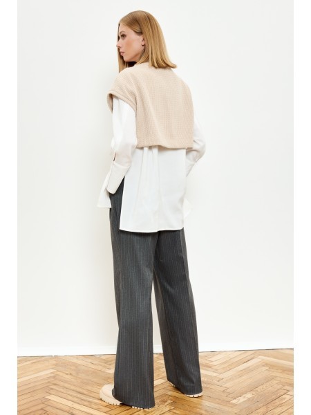 Доступность: в наличии; Производитель: ALLURE; Страна производства: Беларусь; Артикул: 935900; Размеры: 42 - 48; Рост: 170 см; Материал: Жилет- хлопок-65%, полиэстер-35%,Брюки- полиэстер-64%, вискоза-... Показать описание 33%, эластан-3%,Блузка- вискоза-66%, нейлон-29%, спандекс-5%; Длина жилета по спинке: 38 см.; Длина блузки по спинке: 75 см.; Длина рукава: 53 см.; Длина брюк по боковому шву без учета пояса: 108 см.; Рост: 170 см.; Сезон: Демисезон, Весна. Комплект состоит из жилета, блузки и брюк. Жилет прямого силуэта со спущенной линией плеча. Горловина формы лодочка. Пройма и горловина обработаны узкой планкой. Блузка прямого силуэта с центральной застежкой на потайную планку на 7 петель и 7 пуговиц. На левой части переда накладной карман. Спинка с отрезной кокеткой и двумя складками по шву притачивания. Плечевой шов смещен на перед. Рукав одношовный рубашечного покроя с отрезной высокой манжетой на 1 петлю и 1 пуговицу. В локтевом шве рукава обработан разрез. Воротник отложной с отрезной стойкой на 1 петлю и 1 пуговицу. В боковых швах - разрезы. Спинка длиннее переда. Брюки прямого силуэта с притачным прямым поясом со шлевками и с застежкой на 1 петлю и 1 пуговицу. Застежка брюк на тесьму-молнию расположена в среднем шве передних частей. По передним частям брюк по 2 односторонние складки. Брюки с боковыми карманами с наклонным входом. Задние части брюк с вытачками. По передним и задним частям брюк заутюжены стрелки. К брюкам прилагается пояс с обтяжной пряжкой из основной ткани. Фурнитура может быть изменена.