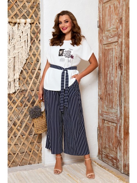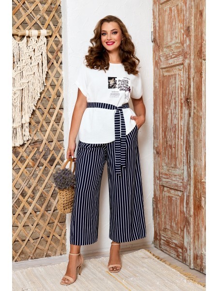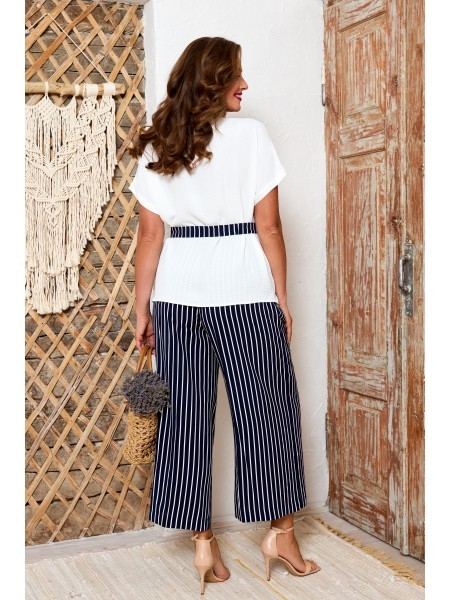 Доступность: в наличии; Производитель: AGATTI; Страна производства: Беларусь; Артикул: 954825; Размеры: 44 - 52; Рост: 164 см; Материал: Вискоза 90%, эластан 10%; Длина блузки: 62 см.; Длина рукава от... Показать описание горловины: 28 см.; Длина кюлот: 93 см.; Сезон: Демисезон, Осень, Весна, Лето. Стильный и практичный комплект, состоит из блузки и кюлот. Блузка прямого силуэта, выполнена из натуральной вискозы. Блузка с округлым вырезом горловины, декорирована дизайнерской печатью. Рукав цельнокроеный, приспущенный. Кюлоты выполнены из вискозы с модным принтом в полоску, на поясе, по переду с застежкой на молнию и пуговицу, в боковых швах функциональные карманы. В комплекте к кюлотам идет пояс из основной ткани. Модель удобная и практичная, отлично подойдет для ежедневной носки в жаркое время.