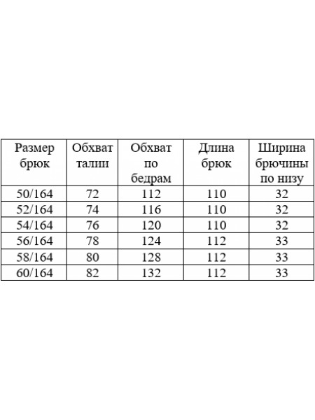 Доступность: в наличии; Производитель: AlaniCollection; Страна производства: Беларусь; Артикул: 898233; Размеры: 52 - 56; Рост: 164 см; Материал: жакет- полиэстер 95%, эластан 5%, юбка-брюки- полиэсте... Показать описаниер 95%, элатсан 5%; Сезон: Демисезон. Жакет со спущенной линией плеча, с центральной застежкой на петли-пуговицы. Спинка с притачной кокеткой. Рукава втачные, одношовные с притачными манжетами, застегивающимися на петлю-пуговицу. Перед жакета и спинка на подкладке. Рукава без подкладки. Длина жакета по среднему шву во всех р-ах -61. Длина рукава – р52-48, р54-47,5, р56-47, р58-46,5. Ширина рукава на уровне глубины проймы ? - р52-22,2, р54-22,9, р56-23,6, р58-24,3. Ширина плеча – р52-25, р54-25,5, р56-26, р58-26,5. ОГ ? - р52-59, р54-61, р56-63, р58-65. ОТ ? - р52-58,5, р54-60,5, р56-62,5, р58-64,5. ОБ ? (по линии низа) – р52-58,5, р54-60,5, р56-62,5, р58-64,5. Брюки классического кроя на притачном поясе с застежкой-молнией и пуговицей на петле. Пояс на резинке по боковым швам. Передние части с имитацией косых боковых карманов. Задние части с талиевыми вытачками. Длина брюк от талии по боковому шву – р52-101, р54-101,5, р56-102, р58-102,5. ОТ ? (с растянутой резинкой)- р52-49, р54-51, р56-53, р58-55. ОБ ? - р52-56, р54-58, р56-60, р58-62