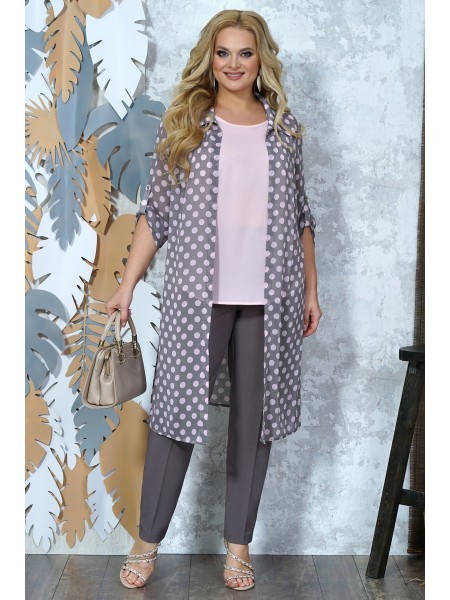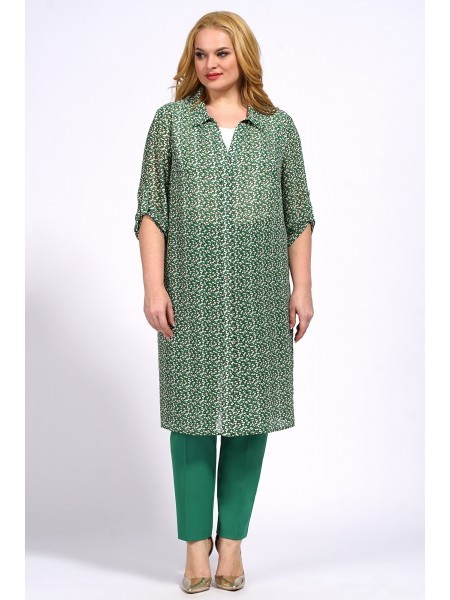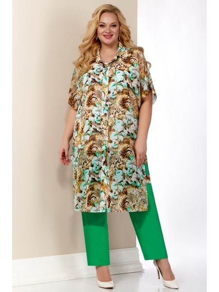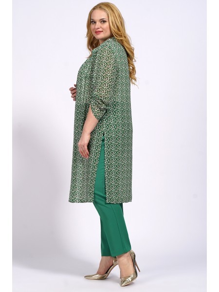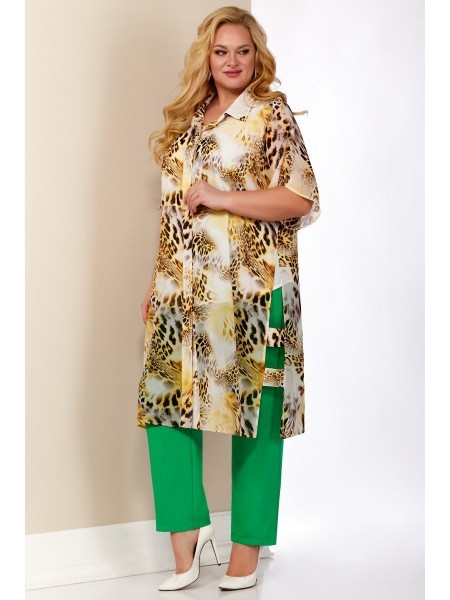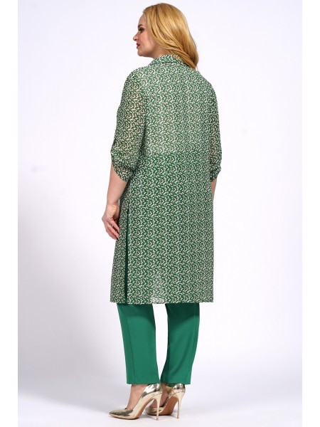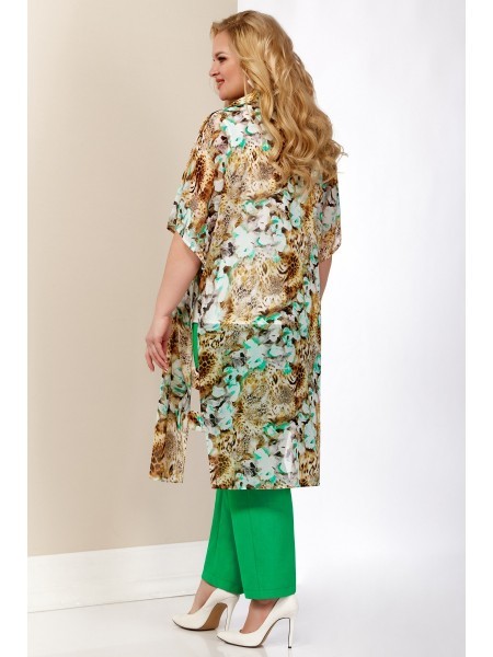 Доступность: в наличии; Производитель: AiraStyle; Страна производства: Беларусь; Артикул: 954787; Размеры: 58 - 62; Рост: 164 см; Материал: Блузка и кардиган- полиэстер 100%Брюки- полиэстер 65%, виско... Показать описаниеза 30%, спандекс 5%; Длина блузки по центру спинки: 62 см.; Длина кардигана по спинке: 105 см.; Длина брюк: 102 см.; Сезон: Весна, Лето. Комплект женский, состоящий из блузки и брюк и кардигана. Блузка из однотонной приятной на ощупь ткани креп шифон, без плечевых накладок, Перед с нагрудными вытачками от пройм. Кардиган выполнен из плинтованной ткани шифон. Рукава спущенного покроя , рубашечного вида воротник, по бокам разрезы с двумя патами. Кардиган застёгивается на 6 петель с декоративными пуговицами. Цвет леопард с цветами зеленными орхидеями, леопард. Брюки из приятной на ощупь ткани лен вишер , зауженные к низу; на притачном поясе с резинкой по бокам, застегивающемся на одну обметанную петлю и одну пуговицу. В среднем шве передних частей брюк застежка по типу «гульфик» на тесьму-«молнию». Цвет молодая зелень.