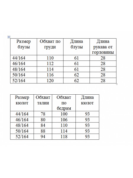 Доступность: в наличии; Производитель: ALEZA; Страна производства: Беларусь; Артикул: 923105; Размеры: 44 - 48; Рост: 170 см; Материал: хлопок 72%, полиэстер 26%, эластан 2%; Сезон: Круглогодичный. Ко... Показать описаниестюм женский, состоящий из блузы и брюк. Блуза прямого силуэта с центральной застежкой на пуговицы с завязывающимися на узел концами и стояче-отложным воротником на отрезной стойке, перед и спинка с цельнокроенными кокетками, по спинке в шве кокетки выполнен разрез фигурной формы. Брюки-кюлоты на притачном поясе, с застежкой спереди на молнию и пуговицу и с боковыми карманами. измерения в готовом виде. длина изделия по спинке 60 см. ширина по груди 44р- 52 см, 46р-54 см, 48р- 56 см. длина брюк по боковому шву 98 см