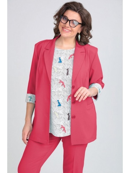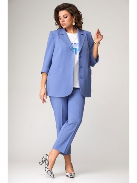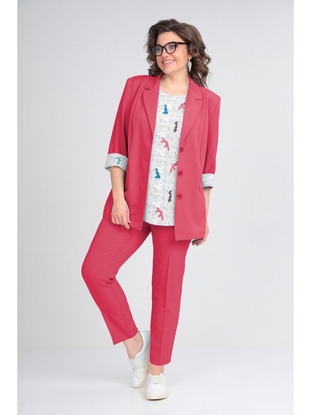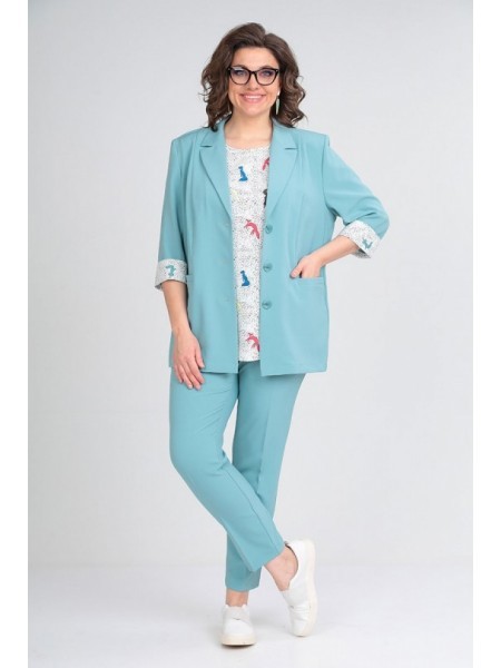 Доступность: в наличии; Производитель: ALEZA; Страна производства: Беларусь; Артикул: 960021; Размеры: 50 - 60; Рост: 164 см; Материал: ПЭ 71%, вискоза 23%, спандекс 6%; Сезон: Демисезон. Костюм женск... Показать описаниеий 3-предметный, состоящий из жакета, топа и брюк. Жакет прямого силуэта без подкладки с центральной застежкой на 3 пуговицы и воротником пиджачного типа. Перед с вертикальными рельефами и прорезными карманами с листочками, спинка со средним швом и отрезными бочками. Рукава втачные двухшовные с притачными манжетами по низу. Брюки прямые зауженные книзу с заутюженными стрелками на притачном поясе с резинками в области боковых швов и застежкой спереди на молнию и пуговицу. Топ из трикотажного полотна с декоративной печатью спереди.