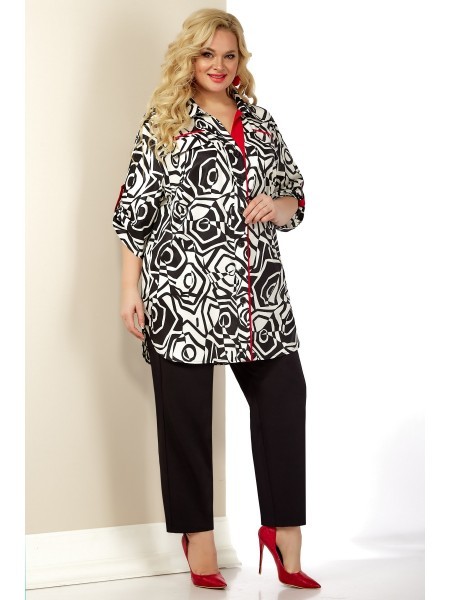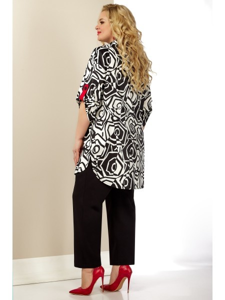 Доступность: в наличии; Производитель: AiraStyle; Страна производства: Беларусь; Артикул: 951303; Размеры: 62 - 66; Рост: 164 см; Материал: Блуза- хлопок 95% , эластан 5%Брюки- полиэстер 70%, вискоза ... Показать описание25%, спандекс 5%; Длина по центру спинки: 90 см.; Длина брюк: 105 см.; Сезон: Весна, Лето. Комплект женский, состоящий из блузки и брюк. Блузка из приятной на ощупь ткани с черно белом принтом, без плечевых накладок, с рубашечным воротником на стойке с боковыми карманами. Рукав спущенный, застегивается на пату красного цвета с пуговицей по переду накладные клапаны карманов обманка. Брюки из эластичной ткани, зауженные к низу; на притачном поясе с резинкой по кругу.