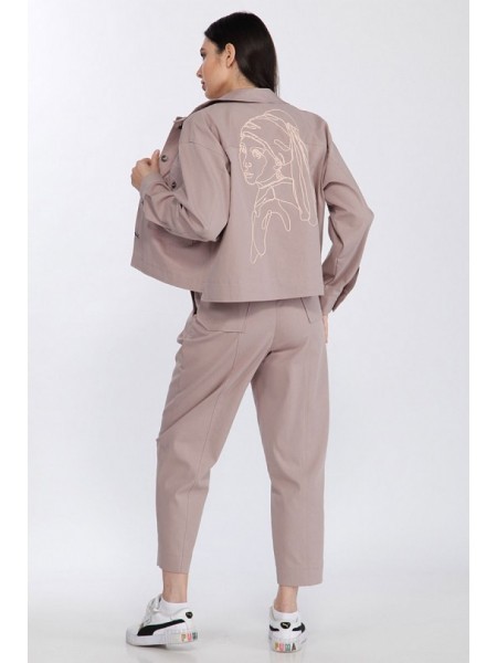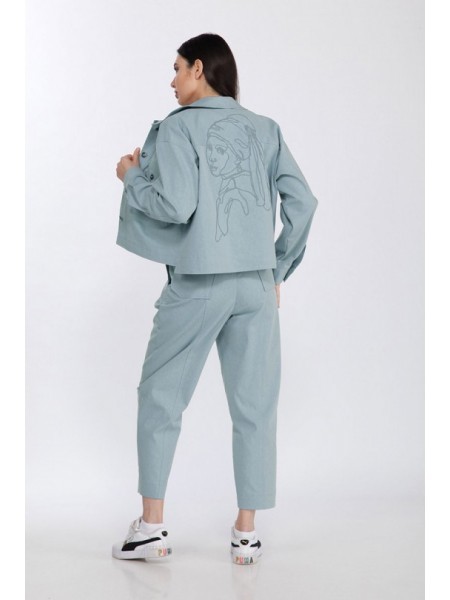 Доступность: в наличии; Производитель: ALEZA; Страна производства: Беларусь; Артикул: 956318; Размеры: 44 - 52; Рост: 164 см; Материал: хлопок 72%, ПЭ 26%, эластан 2%; Сезон: Демисезон. Костюм-двойка ... Показать описаниебрючный. Куртка женская прямая с центральной застежкой на 4 петли и пуговицы со стояче-отложным воротником и фигурным низом, перед с отрезными кокетками, планками, накладными карманами с клапанами на петлях и пуговицах, спинка с кокеткой и вышивкой шнуром по мотивам картины Вермеера. Рукава рубашечные с локтевыми швами и притачными манжетами. Брюки на притачном поясе со складками по поясу и боковыми карманами, задние половинки с накладными карманами фигурной формы и вертикальными рельефами.
