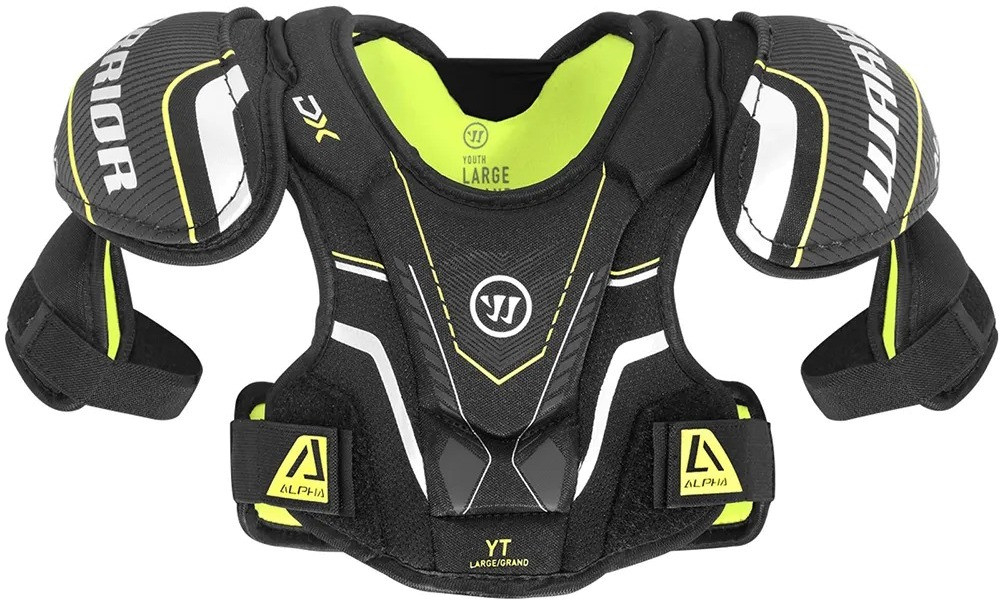 Больше картинок (информации) и таблица размеров на странице. Нагрудник Warrior ALPHA DX YTH обладает анатомической посадкой, где защитные элементы расположены близко к телу игрока. Фронтальная панель нагрудника имеет двухсоставную конструкцию, обеспечивающую максимальную подвижность. Щиток содержит сжатую пену EVA и пену высокой плотности. Сегментированные боковые части имеют конструкцию DX Shell и выполнены из пены EVA с текстурой Shell Skin, которая снижает вес, гарантируя надежную защиту от удара. Материал: Полиэстер со вставками полиуретан