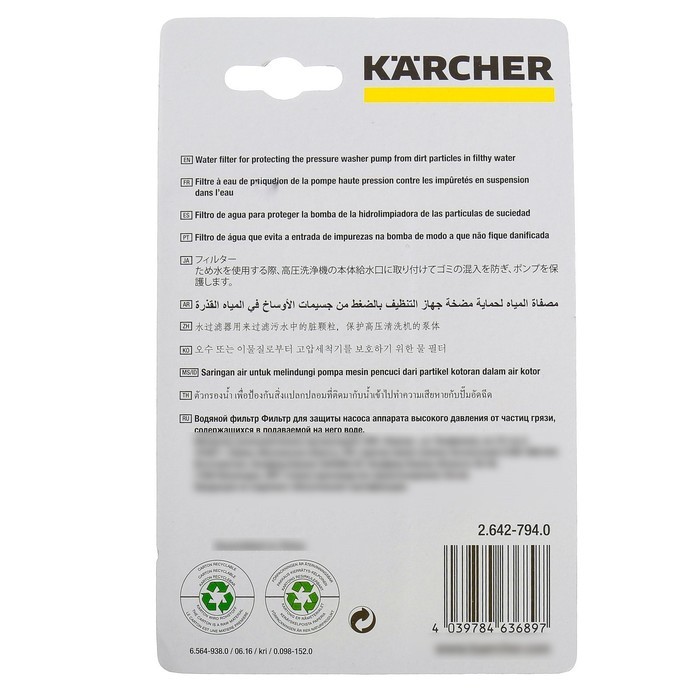 Водяной фильтр Karcher предназначен для защиты насоса аппарата от частиц грязи, содержащихся в подаваемой на его вход воде. Аксессуар обеспечивает более продолжительную работу аппарата. Изделие подход... Показать описаниеит для всех бытовых аппаратов высокого давления Karcher серии К2 - К7. Гарантийный срок, мес.: 12. Состав: металл, пластик, резина.