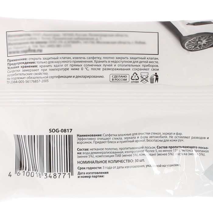 Влажные салфетки Sapfire для стекол, зеркал и фар, 30 шт, с клапаномВопросы по товару