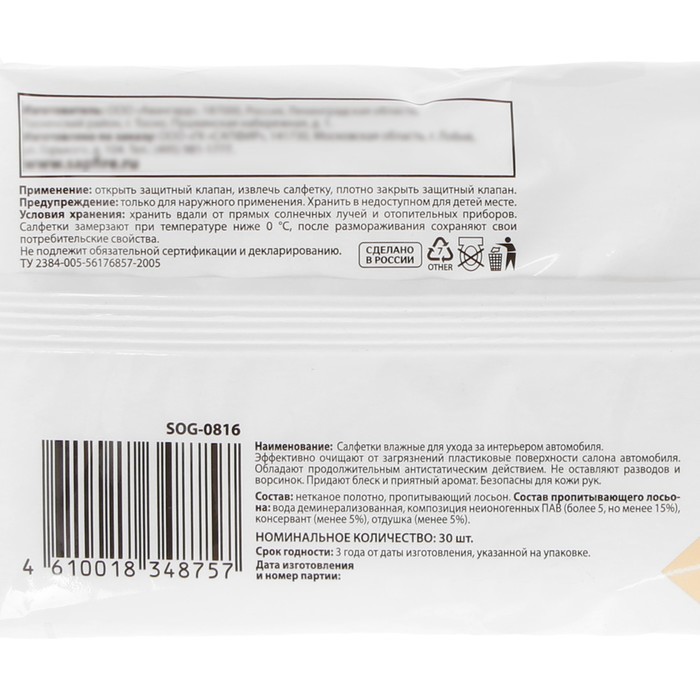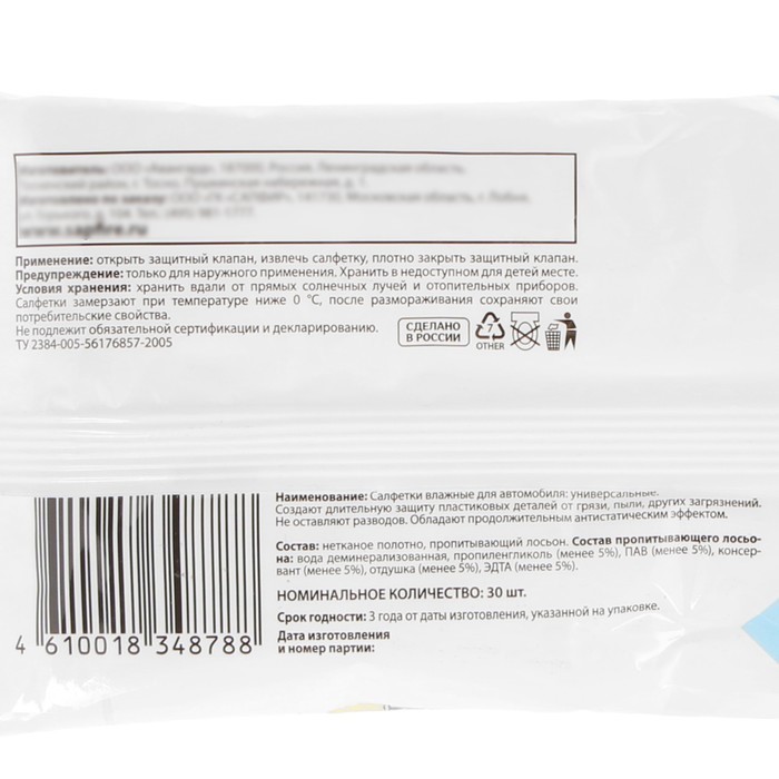 Влажные салфетки Sapfire для ухода за салоном автомобиля, 30 шт, с клапаномВопросы по товару