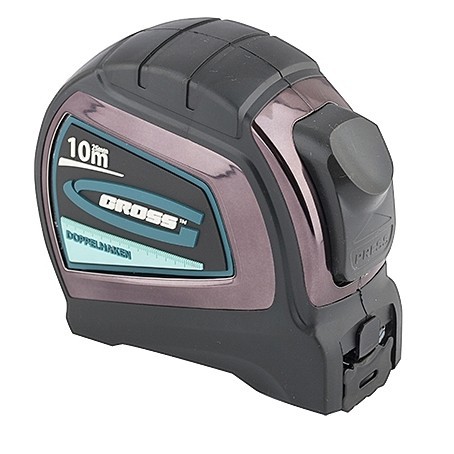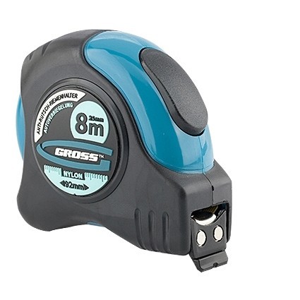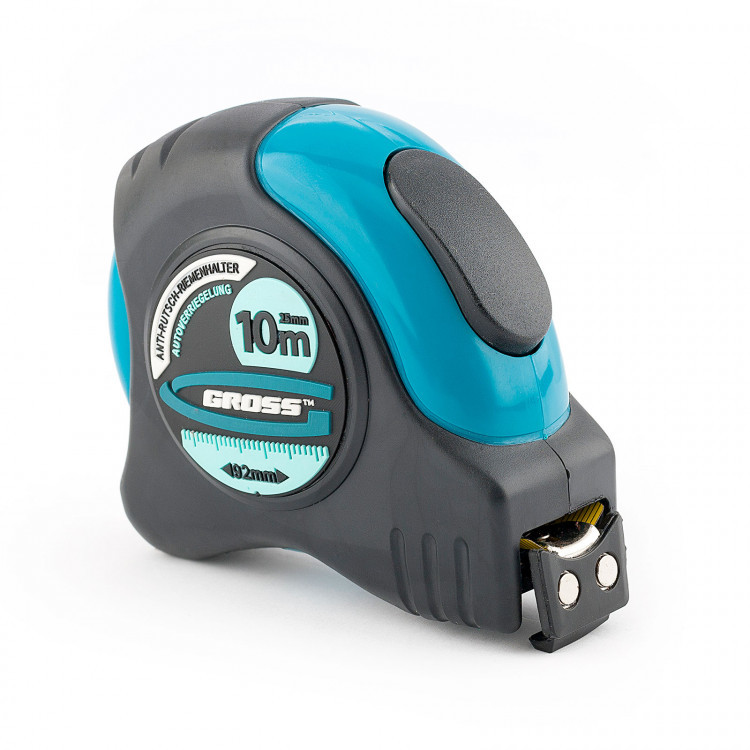 Рулетка Gross «Schlagfest» 31115 с магнитным обрезиненным зацепом, двухсторонней шкалой и функцией автоматической фиксации полотна, 10 м х 25 мм, позволяет определять размеры материалов, вычислять пло... Показать описаниещадь помещения и проводить другие измерительные работы Карманная рулетка — незаменимый инструмент в хозяйстве и на строительной площадке. Магнитный обрезиненный зацеп обеспечивает возможность захвата скользких и металлических поверхностей со сложной формой.Преимущества Удобство работы — измерительная шкала нанесена на ленту с обеих сторон. Автоматический фиксатор и дополнительная кнопка паузы — ленту легко удерживать на нужной длине. Высокая точность замеров от нуля — рулетка оснащена подвижным зацепом. Двухкомпонентный корпус — рулетка из ударопрочного ABS-пластика с обрезиненным покрытием выдерживает падения с небольшой высоты и не проскальзывает в руках. Защита полотна от истирания — на стальной ленте имеется нейлоновое покрытие.