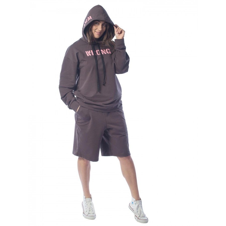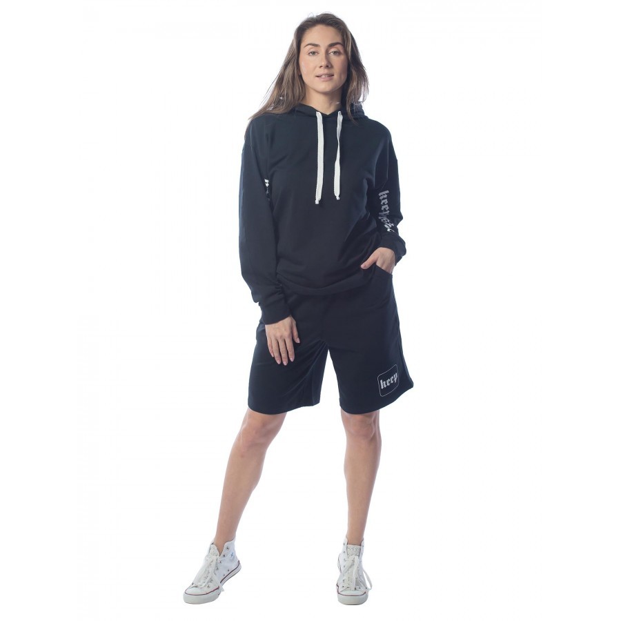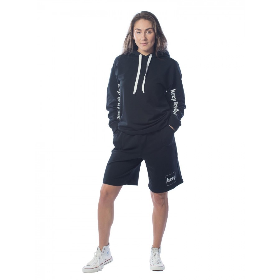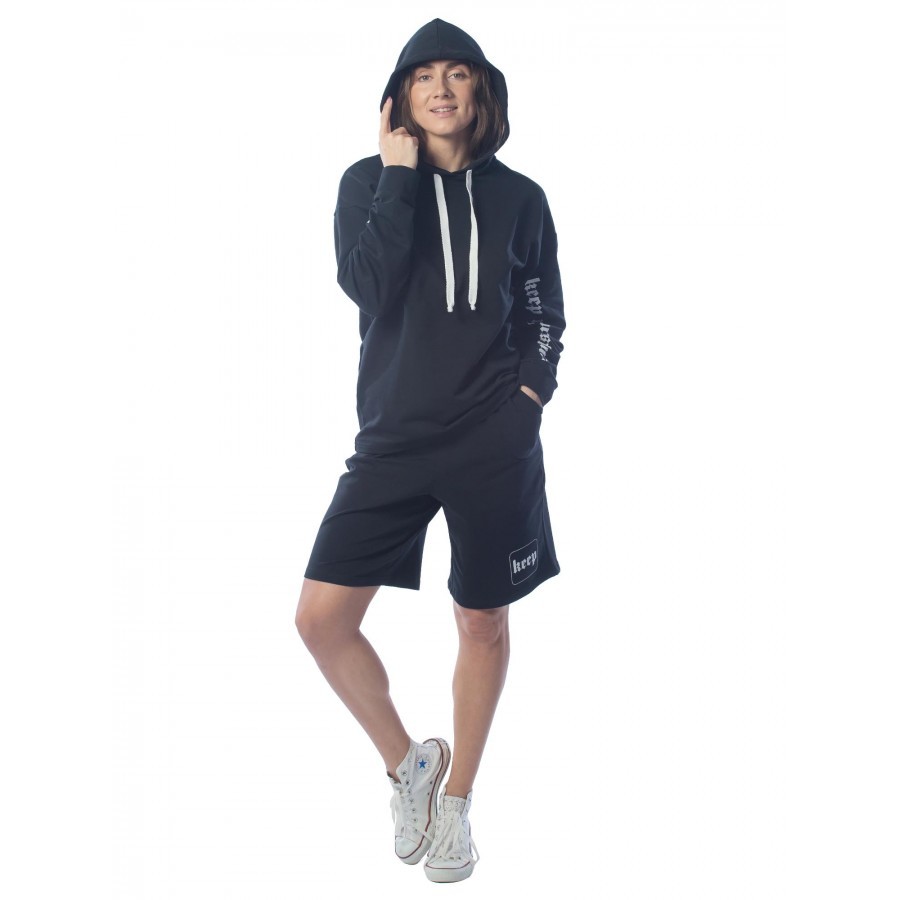 Черный – цвет сезона. Костюм KEEP YOUR DISTANCE, выполненный в угольно-черном цвете, является неповторимой классикой в гардеробе своего владельца. Подойдет фанатам стиля street-wear. Строгий темный от... Показать описаниетенок изделия разбавлен белыми шнурками и трендовыми текстовыми вставками. Толстовка имеет объемный капюшон, что очень удобно при неожиданных осадках. Длина шорт по колено не сковывает движений и делает комплект поистине универсальным, подходящим для разных целей – от занятий спортом до сбора грибов и ягод в теплом лесу. Крой не только комфортный, но и очень модный. На фото модель с параметрами 90.60.90 рост 172см