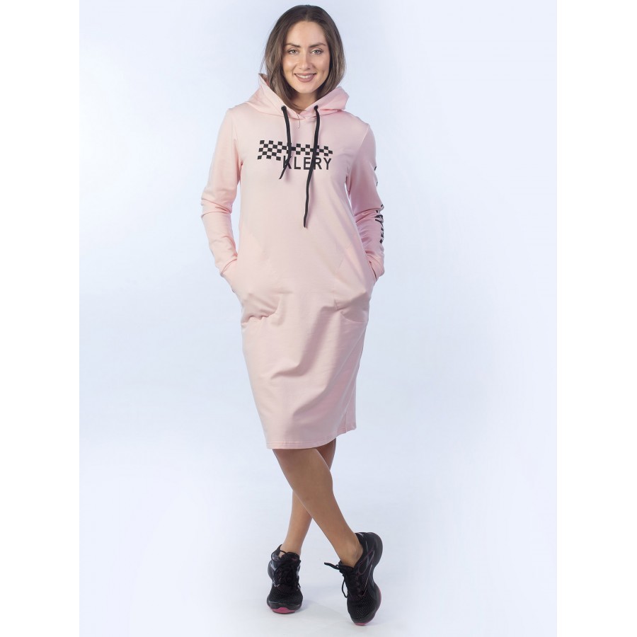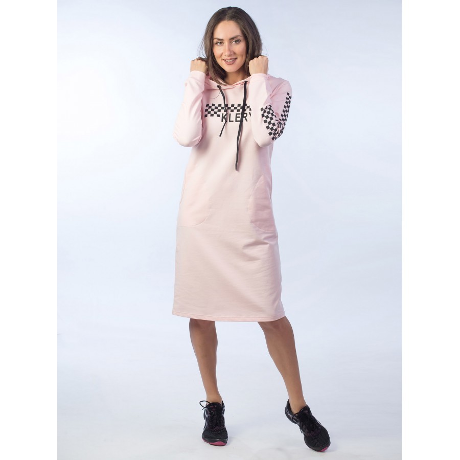 Это платье подходит тем, кто любит выглядеть стильно и не затрачивать на это много времени. Такой фасон идеально впишется как на скучных лекциях, так и для ношения по дому. Нежный оттенок подчеркивает... Показать описание утончённость, а прямой силуэт добавляет удобство в носке, что, безусловно, не создаёт сковывающих движений. Шахматный принт распространяется от груди к целому рукаву, что выглядит эффектно. Длина — миди. Для удобства есть карманы и капюшон с чёрными шнурками для ветреной погоды, которые сочетаются с наклейкой, а также эластичные манжеты под цвет самого платья.
