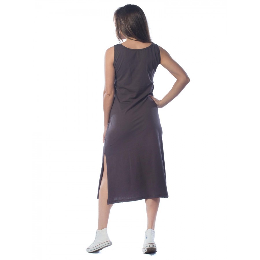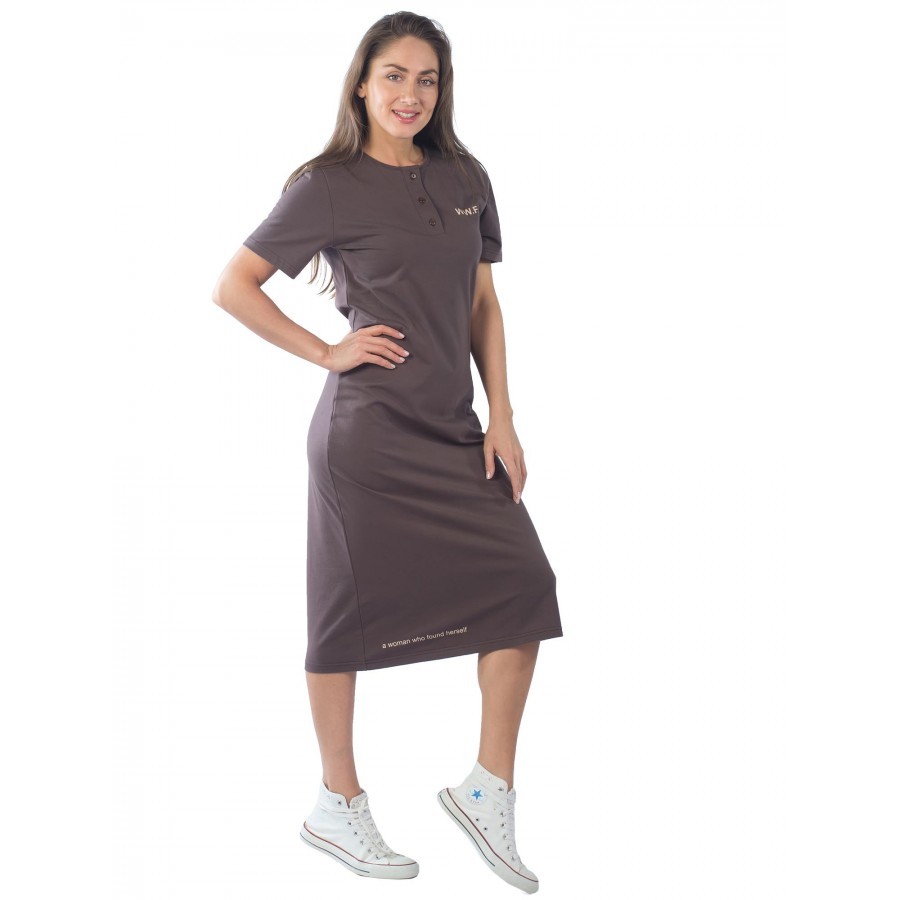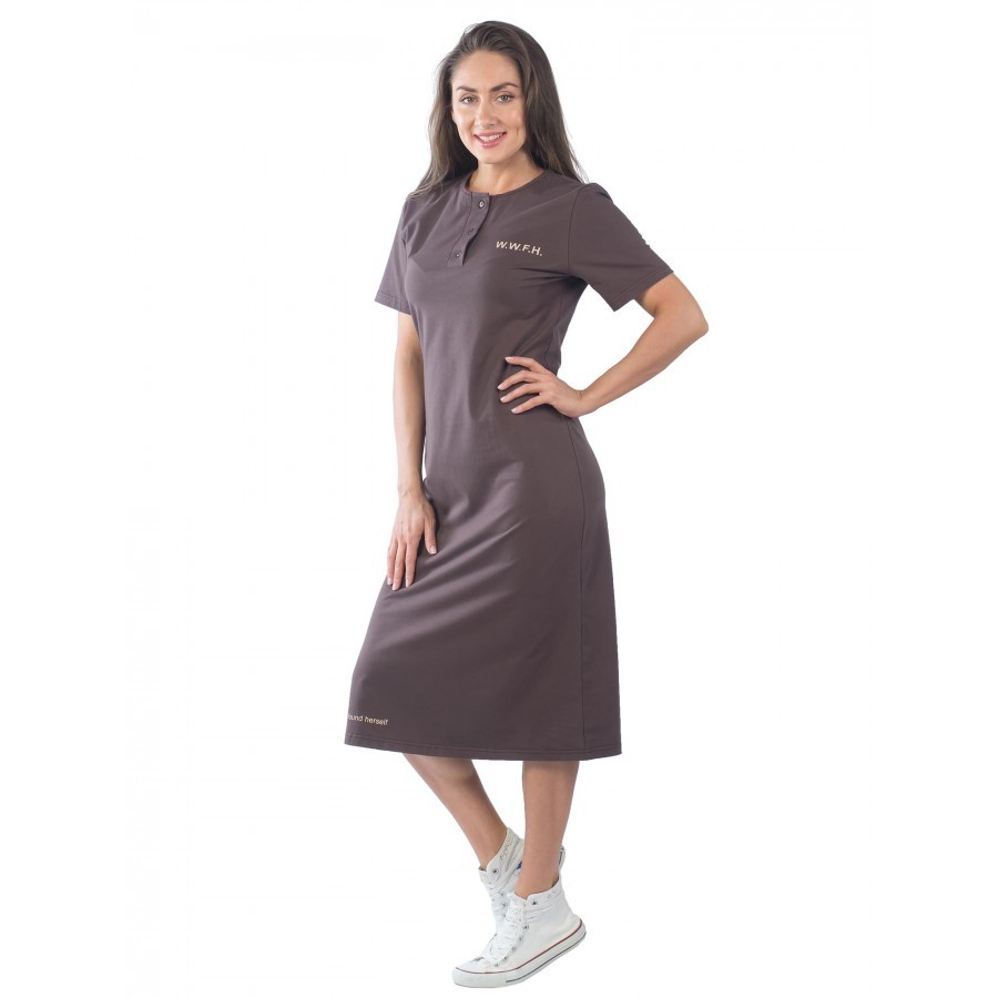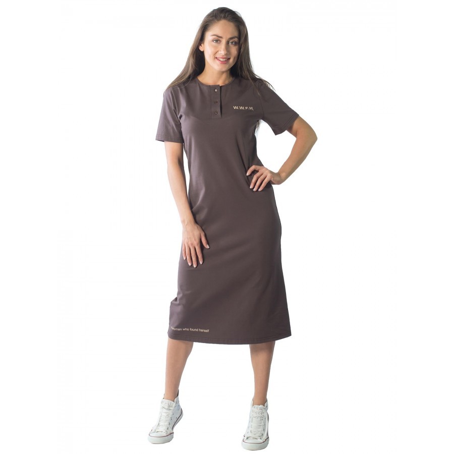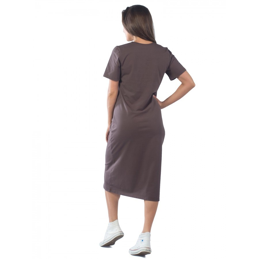 Коричневое удлиненное платье со скромным белым принтом на груди и на подоле украсит любую женщину. В нем вы будете выглядеть хрупкой и желанной. Воротник круглый, с планкой, на пуговицах. Карманов нет... Показать описание, что придает наряду женственности. Изготовлено из трикотажа. Сочетание хлопка с эластаном позволит коже дышать, и в то же время не даст изделию вытягиваться после стирок. Рукава прямые. Свободный фасон не только скроет недостатки фигуры, но и создаст ощущение комфорта, как дома, так и во время прогулок и дачного отдыха. На фото модель 44 размера, с параметрами 90/60/90. Рост модели 172 см.