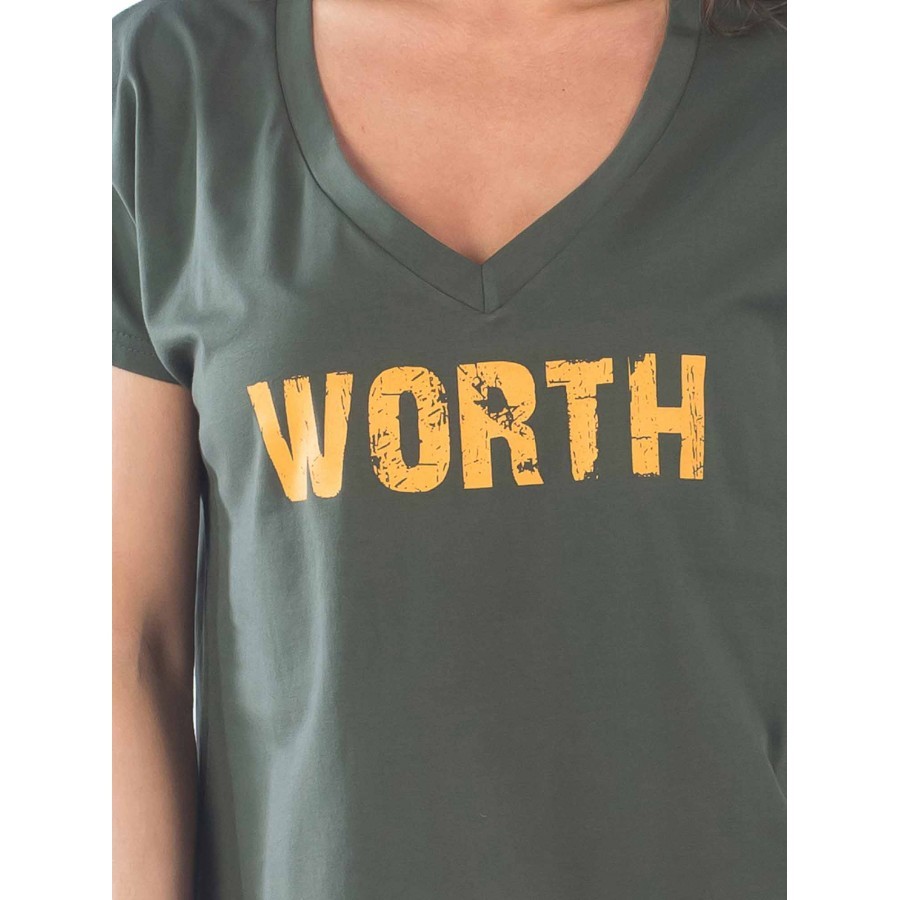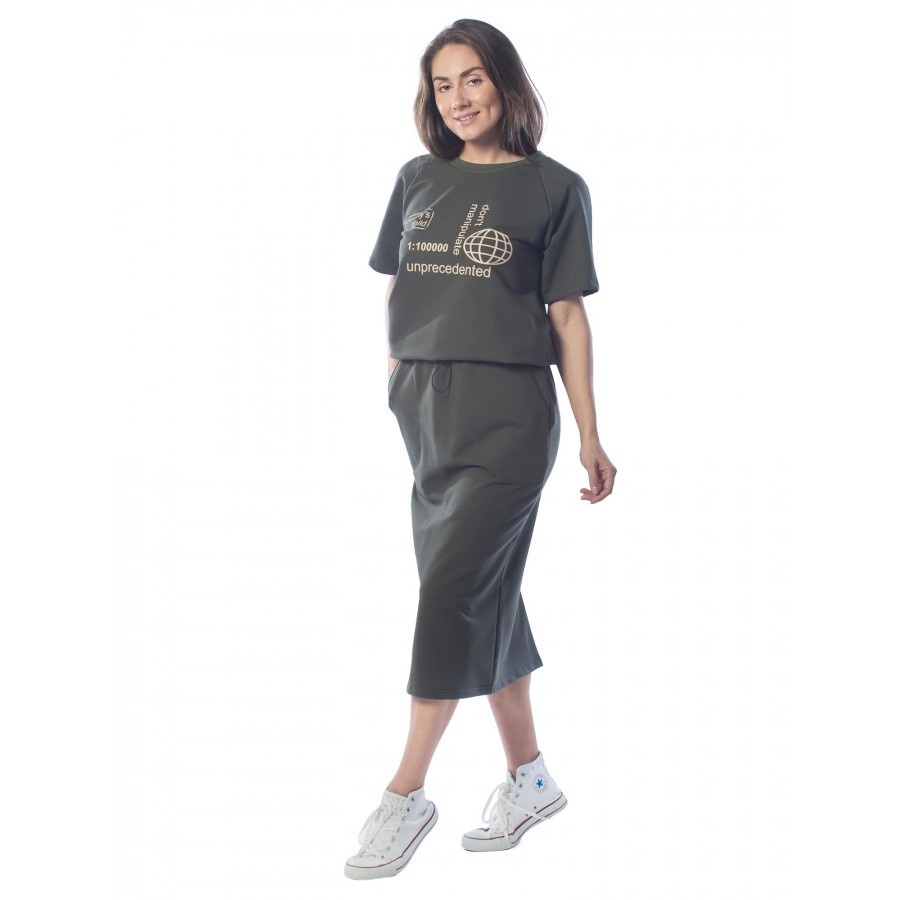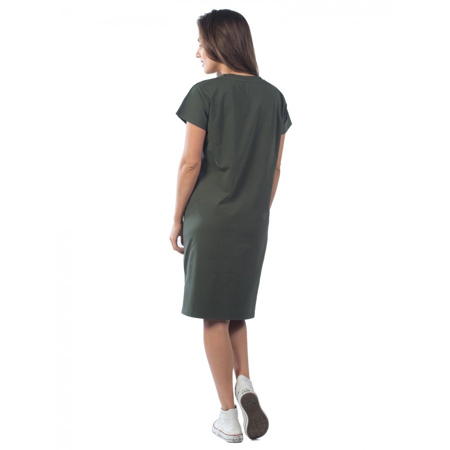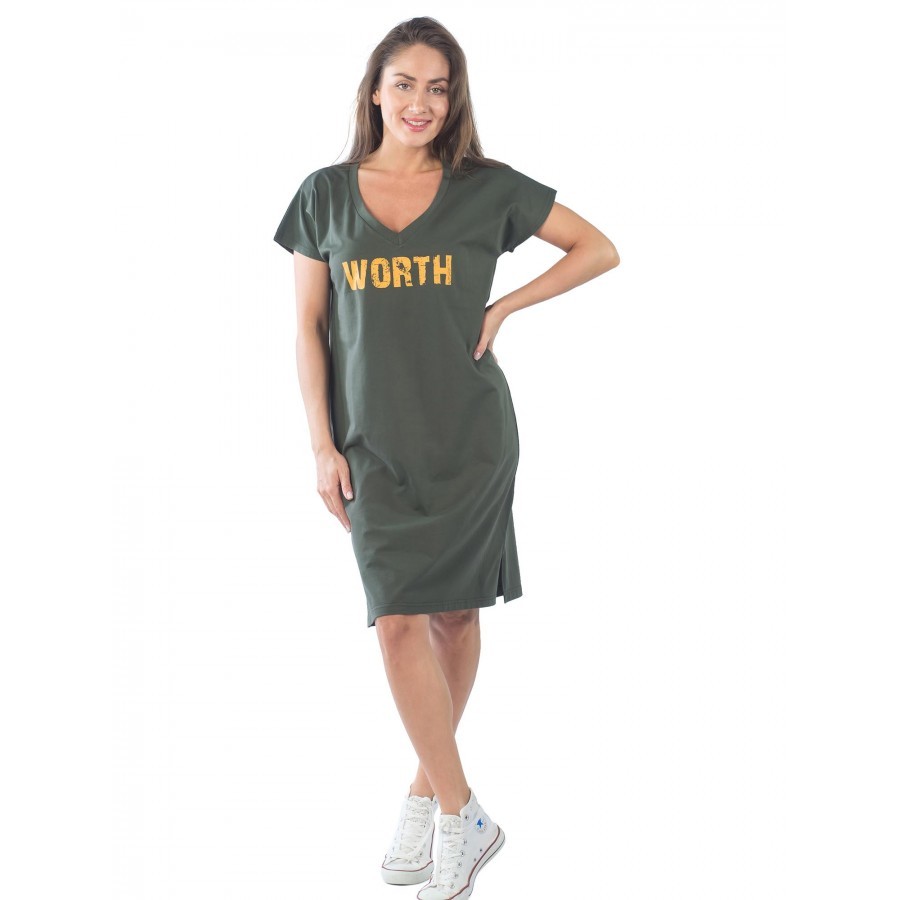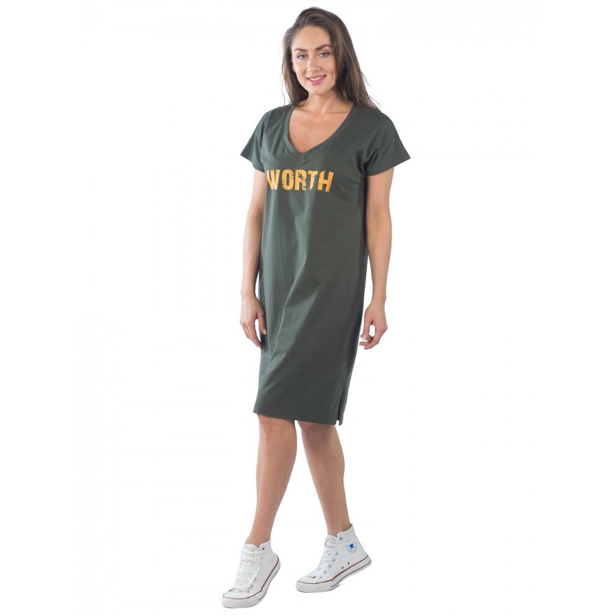 Платье цвета хаки свободного фасона – еще одна жемчужина в нашей коллекции. Спущенное плечо придает ему особый шарм. Украшено принтовой надписью желтого цвета: «WORTH», что означает, «достойная». Таки... Показать описанием образом, она является не только элементом декора, но и говорит сама за себя. Изделие слегка заужено книзу. Но, благодаря боковым разрезам, движения не сковываются. V-образный вырез открывает грудь, что для летнего наряда дополнительное удобство. Ткань смешанная – 92% хлопка и 8 – эластана. Так что, модель не склонна вытягиваться и мяться. Страна производства – Россия. На фото модель 44 размера с параметрами 90/60/90,рост 172 см.
