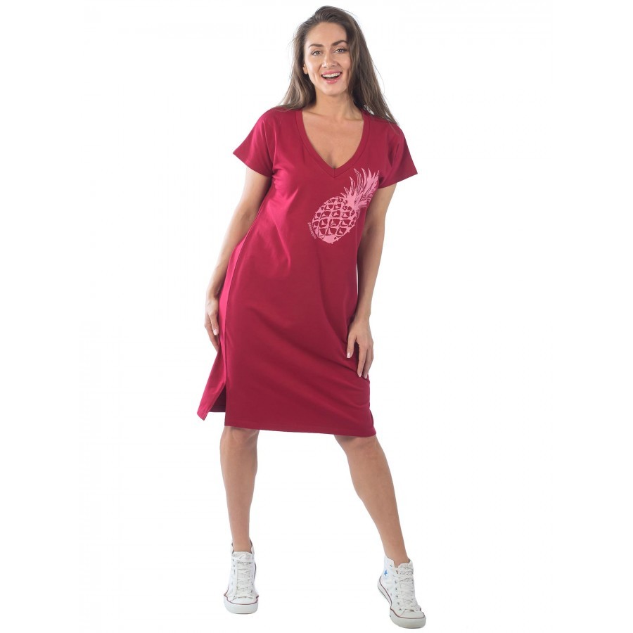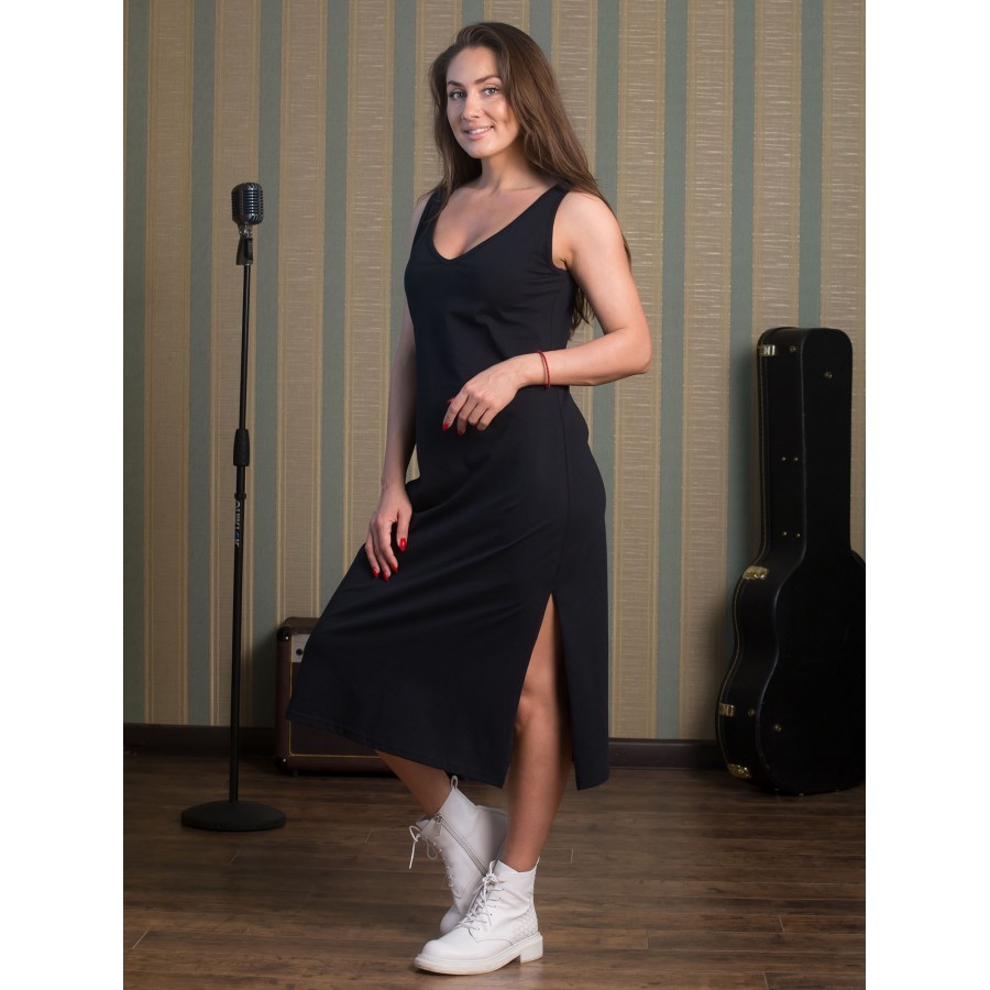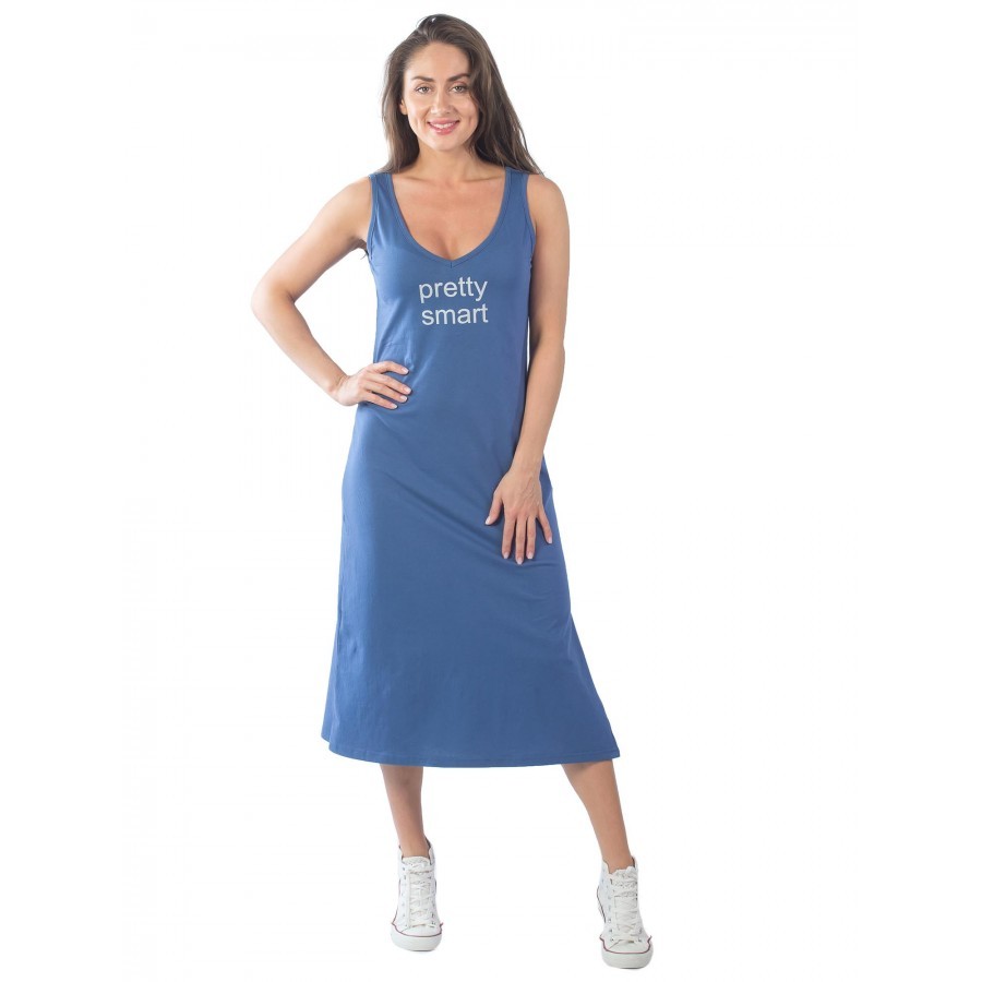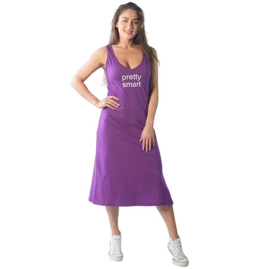 Платье майка – женская одежда (КП1437П2), созданная для отдыха дома или на пляже, так как оно не имеет рукавов и помогает приобрести насыщенный загар в зоне декольте и рук. Сарафан платье имеет притал... Показать описаниеенный крой с тенденцией к зауживанию в районе подола. Также изделие включает в себя боковые разрезы, что придает пикантности выбранному образу. Такой открытый элемент одежды будет уместен и в домашней обстановке, и на улицах города, но в сочетании с легкой джинсовой курткой цвета индиго или хаки. Платье майку с разрезом также можно использовать в качестве ночной сорочки, так как ткань достаточно тонкая и мягкая. Крой изделия позволяет носить вещь и дамам с аппетитными формами, и девушкам стройного телосложения. Все строчки ровные, швы плотные и аккуратные. Главное, обратить внимание на ростовку платья сарафана для дома. Рост модели на фото – 1.72, а параметры фигуры – 90/60/90, и размер платья – 44. При большем объеме по талии можно смело заказать вариант побольше. При желании создать оверсайз-образ имеет смысл остановить свой выбор на платье сарафане повседневном, по крайней мере, на два размера больше. Также ткань склонна к растягиванию, поэтому, чтобы продлить срок службы изделия, можно сделать заказ платья на один размер меньше. Чтобы платье летнее для женщин смотрелось хорошо, необходимо учитывать пропорции, особенно по талии и спинке. Если этого не сделать, линия выреза может смещаться. Соответственно, и длина платья может останавливаться не только в области икр, но и ближе к лодыжкам. При росте выше 1.80 длина платья будет чуть ниже колен. Поэтому при выборе следует ориентироваться на высоту талии и длину торса. Платье сарафан трикотажное изготовлено из натурального материала (хлопок), поэтому подходит для носки в жару, в условиях повышенной влажности, а также в зимний сезон дома, когда активно работает отопительная система. Также спортивное платье майка подойдет для выполнения легких физических упражнений на свежем воздухе. При этом длина изделия накладывает определенные ограничения, например, на спортивные игры. Плотная текстура ткани увеличивает впитывающие свойства материала. При стирке важно соблюдать режим температуры воды, который соответствует 30 °C. Сушить изделие рекомендуется в горизонтальном положении, завернутым в полотенце, чтобы избежать деформации ткани и потери цвета. Вырез у платья V-образный и достаточно откровенный, поэтому платье майка длинное идеально будет смотреться на обладательницах роскошного бюста. Майка домашняя – платье повседневное, представленное в нескольких оттенках: фиолетовое (уходящим в синий оттенок) и бордовое (напоминает малиновый из-за матового эффекта). Красная удлиненная майка, представленная на фото, помимо смелого выреза, имеет английскую надпись, которая носит двойное значение. Игра слов в переводе может означать как «довольно умную» особу, так и «симпатичную и при этом смышленую» девушку.
