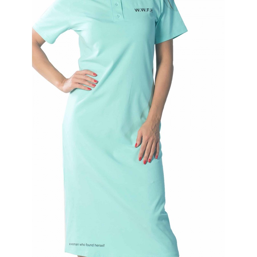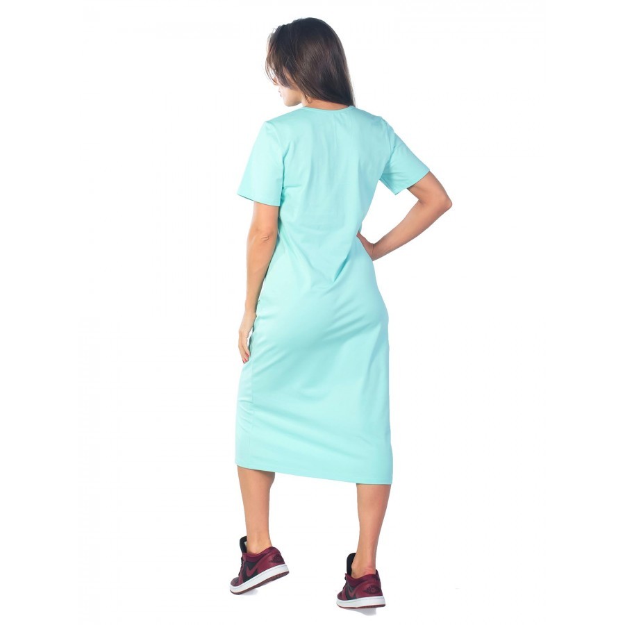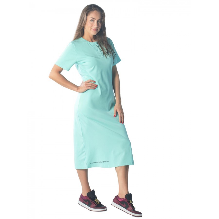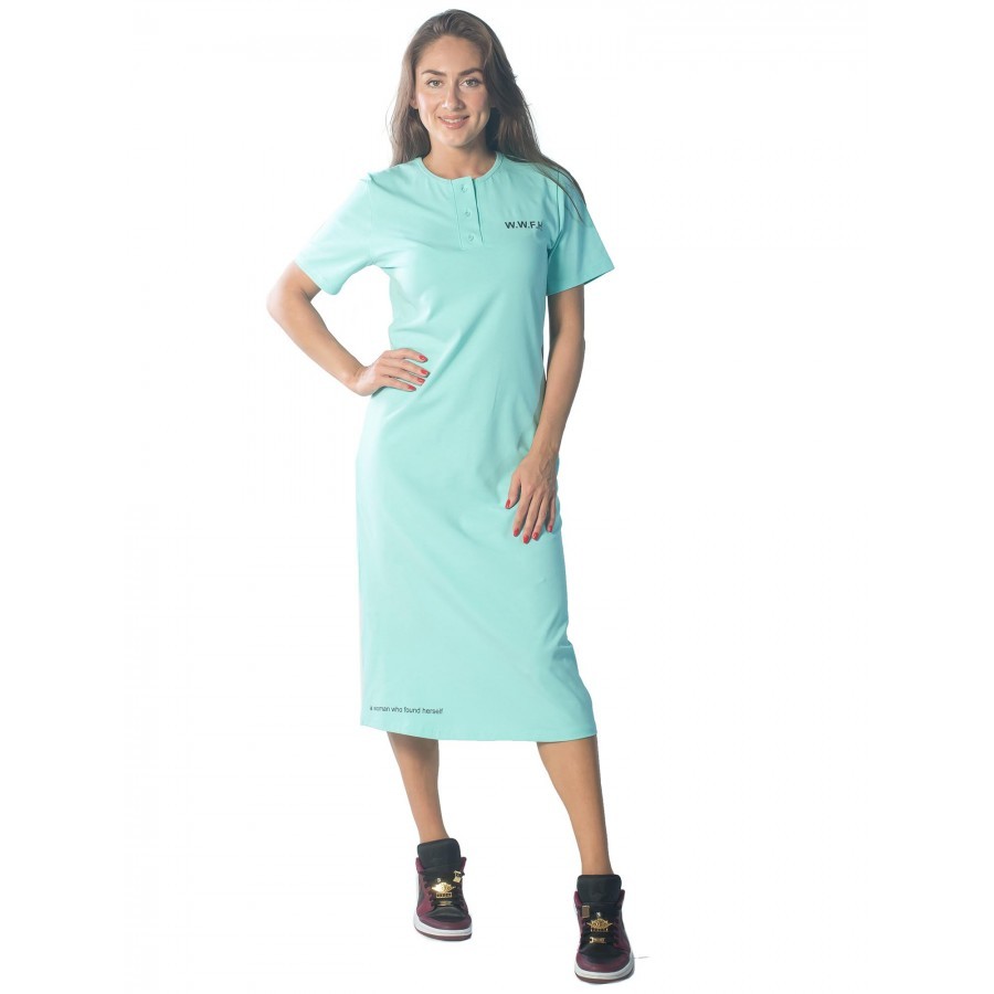 Для повседневных летних образов в спортивном стиле подойдет яркое женское платье с небольшими лаконичными надписями. Изделие выполнено из стопроцентного мягкого хлопка мятного оттенка. Длина ниже клен... Показать описаниеа – универсальная, и подчеркивает выгодные стороны фигуры. Модель сочетается с кроссовками, сандалиями и другой летней обувью. У платья свободный крой, не сковывающий движений. В области горловины представлены пуговицы в тон изделия, ставшие изюминкой товара. С такой одеждой несложно выглядеть стильно и модно летом на прогулке или дома во время отдыха. Сделано в России г. Камышин. На фото модель 44 размера, с параметрами 90/60/90. Рост модели 172 см.