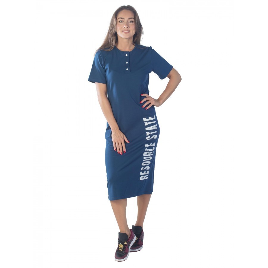 Синее женское платье RESOURCE STATE сшито просто и со вкусом. Такой фасон подойдёт как стройным, так и дамам в теле. Вещь подходит для всех типажей – блондинок, брюнеток, русоволосых и рыжих. Застёгив... Показать описаниеать пуговицы удобно. Красиво смотрятся на фоне цвета осенних сумерек. Короткие рукава давно завоевали симпатию представителей обоих полов, так как не намокают, не пачкаются и не мешают готовке или уборке. Дома – это дополнительный плюс. Свободный покрой и натуральная ткань позволит коже дышать. Изделие понравится женщинам и девушкам разных возрастов. На фото модель 44 размера, с параметрами 90/60/90. Рост модели 172 см.