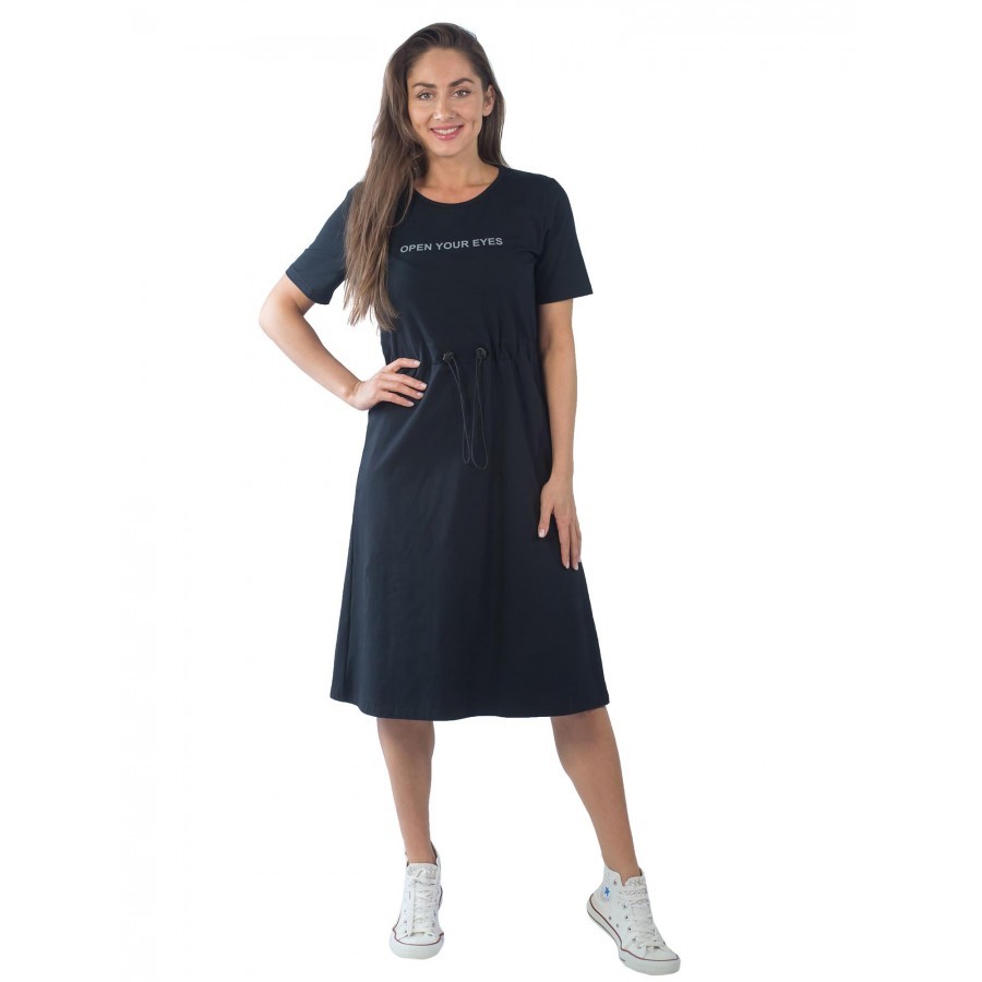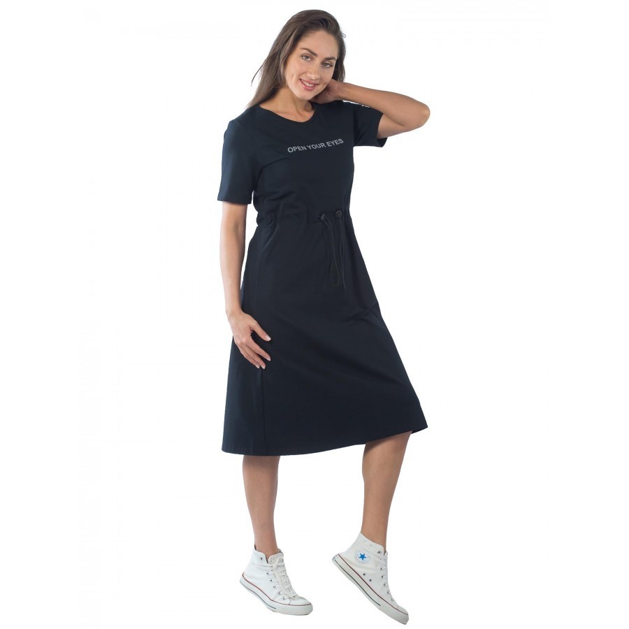 Элегантное женское платье из эластичного трикотажного материала с округлой горловиной, окантованой бейкой. Рукав прямой, короткий. Длина изделия ниже колена. На линии талии с изнаночной стороны-кулиск... Показать описаниеа с шляпной резинкой. Лицевая сторона украшена крупными люверсами с фиксаторами. На полочке небольшой дизайнерский принт "open your eyes". Ваш стильный образ на каждый день! На фото модель 44 размера, с параметрами 90/60/90. Рост модели 172 см.