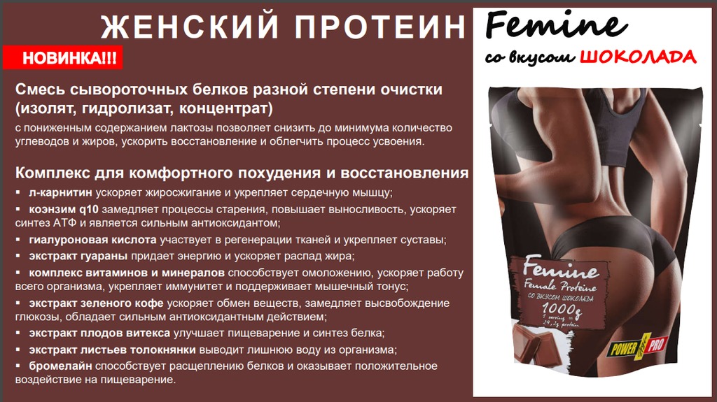 Женский протеин Femine со вкусом ШОКОЛАДА создан специально для девушек, которые ведут активный образ жизни и следят за фигурой. Его формула разработана с учетом всех потребностей женского организма и... Показать описание направлена на создание идеальных форм тела. В протеине Femine- есть ряд действенных экстрактов и компонентов, которые ускорят метаболизм, помогут эффективному жиросжиганию и повысят скорость восстановления вашего организма. Комплекс для комфортного похудения и восстановления: -л-карнитин ускоряет жиросжигание и укрепляет сердечную мышцу; коэнзим q10 замедляет процессы старения, повышает выносливость, ускоряет синтез АТФ и является сильным антиоксидантом; гиалоурановая кислота участвует в регенерации тканей и укрепляет суставы; -экстракт гуараны придает энергию и ускоряет распад жира; комплекс витаминов и минералов способствует омоложению, ускоряет работу всего организма, укрепляет иммунитет и поддерживает мышечный тонус; -экстракт зеленого кофе ускоряет обмен веществ, замедляет высвобождение глюкозы, обладает сильным антиоксидантным действием; -экстракт плодов витекса улучшает пищеварение и синтез белка; -экстракт листьев толокнянки выводит лишнюю воду из организма; -бромелайн способствует расщеплению белков и оказывает положительное воздействие на пищеварение. Состав: белки молочной сыворотки (концентрат, изолят, гидролизат), какао-порошок, загуститель, экстракт зеленого кофе, ароматизатор натурального шоколада, л-карнитин, экстракт листьев толокнянки, экстракт плодов витекса, бромелайн, кальций, калий, магний, железо, цинк, медь, марганец, йод, селен, лимонная кислота , карамельный колер, сукралоза, лецитин соевый, экстракт плодов и семян гуараны, аскорбиновая кислота, токоферола ацетат, никотинамид, пиридоксина гидрохлорид, пантотенат кальция, рибофлавин, ретинола ацетат, тиамина гидрохлорид, фолиевая кислота, биотин, цианокобаламин, гиалуроновая кислота, коэнзим Q10, кофеин.