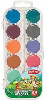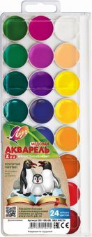 Краски акварельные "Классика" медовые полусухие изготовлены на основе органических пигментов и натурального связующего с добавлением пчелиного мёда, находятся в пластмассовой упаковке с прозрачной кры... Показать описаниешкой. Акварель предназначена для детского творчества и различных живописных работ. Акварель "Классика" отличается следующими свойствами: - Прозрачность красок - Яркость и чистота цвета - Отличная разносимость и размываемость - Соответствует европейским (знак CE) директивам безопасности. В наборе 24 цвета. Кисть в набор не входит. Для детей от 3 лет. Рейтинг на сайте labirint.ru: 9.67. Больше картинок и возможность полистать книгу на странице.