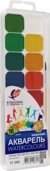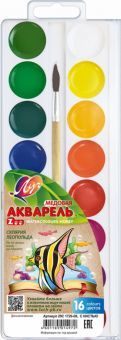 Акварель медовая "Классика". Краски прозрачные, водоразбавляемые, быстро сохнут. В наборе краски (16 цветов), кисть (№3, круглая). Для детей старше 3-х лет. Рейтинг на сайте labirint.ru: 9.00. Больше картинок и возможность полистать книгу на ... Показать описаниестранице.