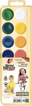 Набор акварельных красок "Школа творчества" - высококачественная краска для детского творчества, изготовленная по классической рецептуре. Отличительная особенность линейки - удобное расположение цвето... Показать описаниев краски группами: холодные-тёплые оттенки, что позволяет развивать у детей цветовосприятие и гармонию. В акварели есть мёд, что значительно улучшает её качество и внешний вид. Прозрачная основа при нанесении, без вкраплений. Безопасна для детей (безопасность продукции гарантируют регулярные проверки на соответствие требованиям по безопасности Российского законодательства, требованиям Таможенного союза и требованиям по безопасности гармонизированных стандартов ЕС). Акварель легко смывается с рук и одежды. Краски упакованы в пластмассовую коробочку с прозрачной крышкой, классические круглые кюветы. В наборе краски 14 цветов. Кисть в набор не входит.
