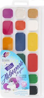 Высококачественная краска для детского творчества, изготовленная по классической рецептуре с использованием мёда. Яркие, чистые цвета. В наборе две кюветы с акварелью цвета "золото" и "серебро". Аквар... Показать описаниеель прекрасно размывается и разносится по поверхности бумаги. Легко наполняется на кисть. Часто используемые цвета в увеличенных кюветах Краска легко смывается с рук и одежды. Безопасна для детей. 18 цветов.