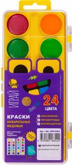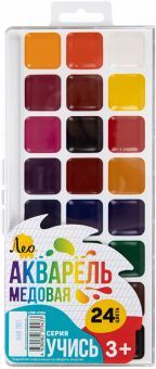 Медовая акварель ТМ Лео серии "Играй" сделает знакомство ребенка с этой непростой техникой приятным, увлекательным и веселым. Прекрасно подходит для занятий рисованием в детском саду, кружках, дома, ш... Показать описаниеколе. Акварель разработана с учетом рекомендаций педагогов, безопасна для детей, не токсична. Изготавливается на основе только натуральных компонентов. Медовая акварель ТМ Лео серии "Играй" обладает следующими потребительскими свойствами: - краски легко набираются на кисть без предварительного размачивания, - не дают грязи при смешивании, - прекрасно размываются водой и смешиваются между собой, - чистые, яркие цвета, - быстро высыхают, - легко смываются с рук и отстирываются с одежды, - отличаются прекрасной разносимостью и отлично ложатся на бумагу, - соответствуют международным стандартам безопасности, - срок годности не ограничен. В наборе 24 цвета. Кисть в комплект не входит. Акварель выпускается в классическом пластиковом пенале с...