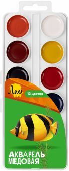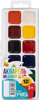 Медовая акварель ТМ Лео серии "Учись" сделает знакомство ребенка с этой непростой техникой приятным, увлекательным и веселым. Прекрасно подходит для занятий рисованием в детском саду, кружках, дома, ш... Показать описаниеколе. Акварель разработана с учетом рекомендаций педагогов, безопасна для детей, не токсична. Изготавливается на основе только натуральных компонентов. Медовая акварель ТМ Лео серии "Учись" обладает следующими потребительскими свойствами: - краски легко набираются на кисть без предварительного размачивания, - не дают грязи при смешивании, - прекрасно размываются водой и смешиваются между собой, - чистые, яркие цвета, - быстро высыхают, - легко смываются с рук и отстирываются с одежды, - отличаются прекрасной разносимостью и отлично ложатся на бумагу, - соответствуют международным стандартам безопасности, - срок годности не ограничен. В наборе 12 цветов. Кисть в комплект не входит. Акварель выпускается в классическом пластиковом пенале с...