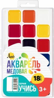 Медовая акварель ТМ Лео серии "Учись" сделает знакомство ребенка с этой непростой техникой приятным, увлекательным и веселым. Прекрасно подходит для занятий рисованием в детском саду, кружках, дома, ш... Показать описаниеколе. Акварель разработана с учетом рекомендаций педагогов, безопасна для детей, не токсична. Изготавливается на основе только натуральных компонентов. Медовая акварель ТМ Лео серии "Учись" обладает следующими потребительскими свойствами: - краски легко набираются на кисть без предварительного размачивания, - не дают грязи при смешивании, - прекрасно размываются водой и смешиваются между собой, - чистые, яркие цвета, - быстро высыхают, - легко смываются с рук и отстирываются с одежды, - отличаются прекрасной разносимостью и отлично ложатся на бумагу, - соответствуют международным стандартам безопасности, - срок годности не ограничен. В наборе 18 цветов. Кисть в комплект не входит. Акварель выпускается в классическом пластиковом пенале...