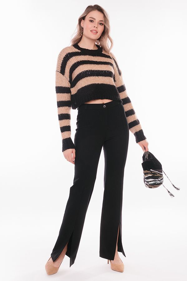 Модные молодежные брюки из трикотажного полотна. Силуэт клеш от колена. Детали: застажка на молнию и пуговицу, пояс продублирован эластичной лентой. Спереди вертикальный рельеф с отстрочкой, заканчива... Показать описаниеется разрезами, сзади кокетка. Длина по внутреннему шву - 82 см. Ширина низа -23 см. Длина разреза - 24,5 см. Числовые параметры соответствуют размеру 42 . Размер модели на фото : 44. Параметры модели на фото: 86-63-94. Рост модели на фото: 173 см. Производитель: Черно-Красная Этикетка Состав ткани: Нейлон 62%, Вискоза 35%, Спандекс 3% Сезон: Весна - Осень Пол: Женский Посадка: Высокая Силуэт: Клеш от колена Длина: Полная Дизайн ткани: Однотонный трикотаж Цвет: Черный Тэги: * Весна-Осень * Клеш от колена * Полная * Высокая посадка * Черный * Трикотаж