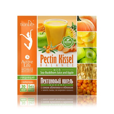 Пектиновый кисель с соком облепихи и яблоком «Баланс» создан, чтобы организм работал как часы! В его состав входят компоненты, которые самым благотворным образом влияют на работу желудочно-кишечного т... Показать описаниеракта и позволяют чувствовать себя великолепно! Без сахара, крахмала, усилителей вкуса, консервантов и красителей – только натуральные компоненты в составе и всего 30 килокалорий в одной порции! Кисель от TianDe содержит овсяные волокна, очищающие организм, активный пребиотик инулин и пектин. Морковный и облепиховый соки укрепляют иммунитет и заряжают тебя энергией яблоки и тыква улучшают пищеварение ананасовый сок способствует избавлению от лишнего. Пектиновый кисель – это вкусный способ поддержать свой желудочно-кишечный тракт. Забудь о проблемах с пищеварением, теперь твой организм будет работать без перебоев! Пектиновые кисели от TianDe станут отличным перекусом или дополнением к основному приему пищи и займут достойное место в твоем ежедневном рационе! Применение: Добавить 180–200 мл горячей воды, тщательно размешать. Через 2–3 минуты продукт готов к употреблению.