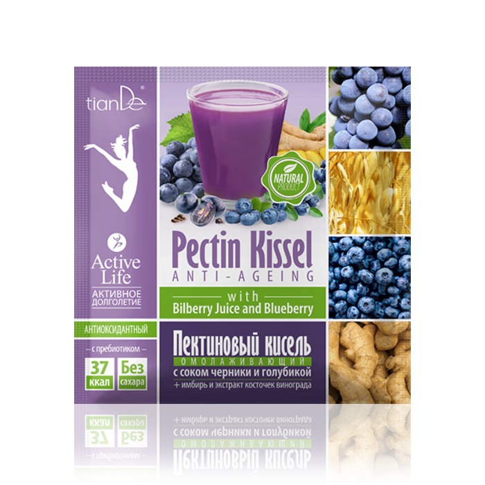 Пектиновый кисель с соком черники и голубикой «Омолаживающий» поможет тебе повернуть время вспять! Без сахара, крахмала, усилителей вкуса, консервантов и красителей – только натуральные компоненты в с... Показать описаниеоставе и всего 37 килокалорий в одной порции! Кисель от TianDe содержит овсяные волокна, очищающие организм, активный пребиотик инулин и пектин. В него также входят самые «омолаживающие» компоненты: голубика, черника, имбирь и экстракт виноградных косточек. Они содержат особые компоненты – антоцианы – природные красители, которые придают фруктам и ягодам насыщенный цвет. Антоцианы – это мощные антиоксиданты, которые: - защищают организм от свободных радикалов, а значит, продлевают молодость - снижают хрупкость и ломкость капилляров. Пектиновый кисель – это вкусный способ поддержать свой желудочно-кишечный тракт! Он станет отличным перекусом или дополнением к основному приему пищи и займет достойное место в твоем ежедневном рационе! Забудь о проблемах с пищеварением, теперь твой организм будет работать без перебоев! Применение: добавить 180–200 мл горячей воды, тщательно размешать. Через 2–3 минуты продукт готов к употреблению.