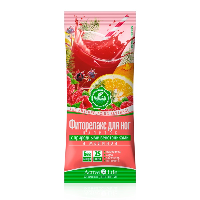 На 100% натуральный напиток с природными венотониками и соком малины подарит ногам ощущение легкости, сосудам – эластичность, наполнит каждое движение легкостью! Без сахара, усилителей вкуса, консерва... Показать описаниентов и красителей! Активные компоненты напитка, работая в комплексе, помогают привести в тонус вены, препятствуют появлению застоя, способствуют улучшению циркуляции лимфы и снижению отеков. В одной порции напитка всего 25 килокалорий. «Фиторелакс» поможет не только сохранить здоровье, но и поддержать фигуру! Напиток «Фиторелакс для ног» обладает накопительным эффектом! Применение: добавить 150-170 мл теплой или прохладной воды, тщательно размешать. Напиток готов к употреблению.