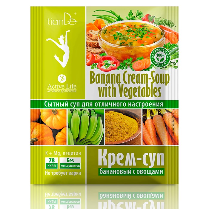 Приготовить экзотическое блюдо за 3 минуты? С пользой для организма и фигуры? Записывай рецепт: берем только натуральные компоненты – муку зеленых бананов, тыкву, картофельные хлопья, добавляем лецити... Показать описаниен, приправляем щепоткой специй и овощей – и получаем банановый крем-суп с овощами от TianDe! Это на 100% натуральное «блюдо», созданное на Алтае, улучшает микрофлору кишечника за счет присутствия в его составе пребиотика – полезного резистентного крахмала из муки зеленых бананов, способствует нормализации жирового обмена и благоприятно воздействует на печень. Сбалансированный состав супа, натуральные ингредиенты и всего 78 килокалорий в одной порции позволяют включать продукт в программу снижения веса. Без ГМО, трансжиров, красителей, консервантов, глютена. Крем-суп не требует варки: просто добавь воды, подожди несколько минут и наслаждайся вкусом и пользой! Применение: Добавить 150 мл кипятка, тщательно размешать. Через 2–3 минуты продукт готов к употреблению.
