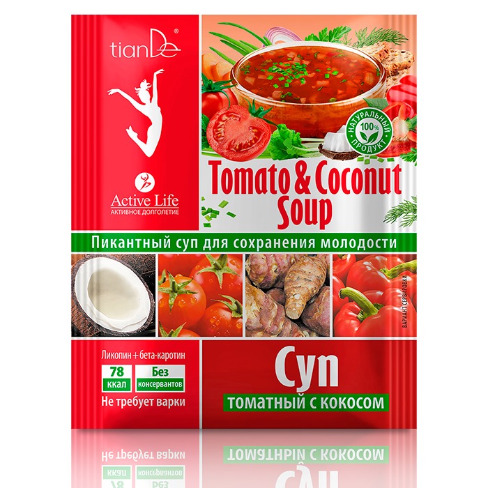 Хочешь разнообразить свой рацион новыми блюдами и не тратить на это много времени? Попробуй пикантное сочетание томата и кокоса, разнообразие вкусов топинамбура, моркови и картофеля, которые гармоничн... Показать описаниео объединились в полезном супе от TianDe. Томатный суп с кокосом – это всего 78 килокалорий, на 100% натуральный состав и польза для организма. В состав супа мы включили источники натуральных пребиотиков и пищевых волокон, которые благоприятно влияют на микрофлору кишечника, помогают организму избавиться от шлаков и токсинов, поддерживают стройность фигуры и свежесть кожи лица. Активные растительные компоненты в составе поддерживают сердечно-сосудистую систему, не перегружают ее холестерином и жирами и создают благоприятные условия для ее нормального функционирования. Продукт создан в экологически чистом регионе, на Алтае. Не содержит ГМО, трансжиров, консервантов и красителей, глютена. Суп идеален для обеда или ужина, а также для перекусов. Легкие пакетики удобно брать с собой в поездку, командировку, путешествие! Не требует варки: просто добавь воды и наслаждайся! Применение: добавить 150–160 мл кипятка, тщательно размешать. Через 2–3 минуты продукт готов к употреблению.